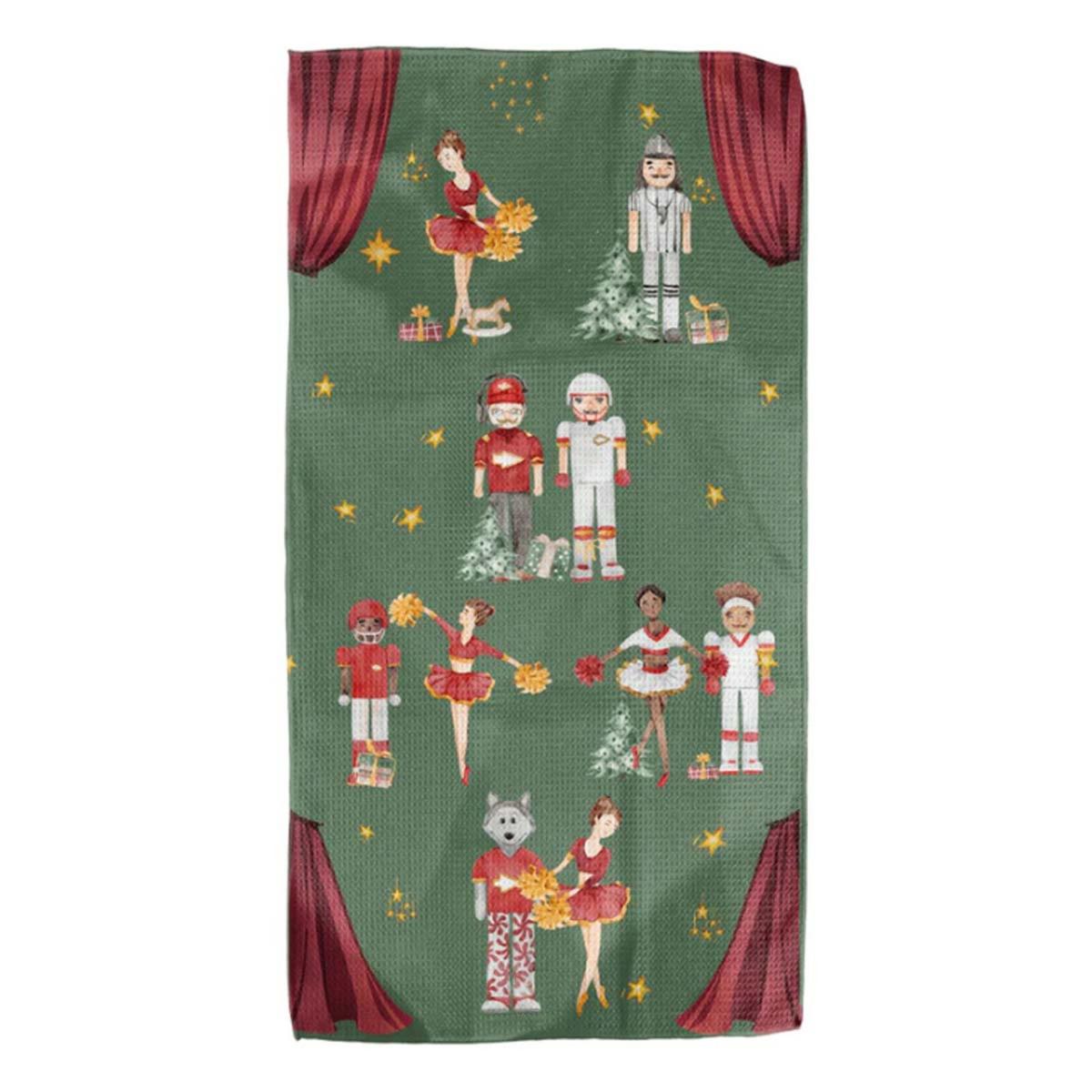 Bring holiday magic to your kitchen with our Watercolor Nutcracker Towel. This 18x30 double-sided towel features one side with a charming green stage scene filled with whimsical nutcracker dancers and cheerleaders in vibrant Kansas City-inspired uniforms. The reverse is a deep holiday plaid with a single classic dancer for a timeless Christmas touch.