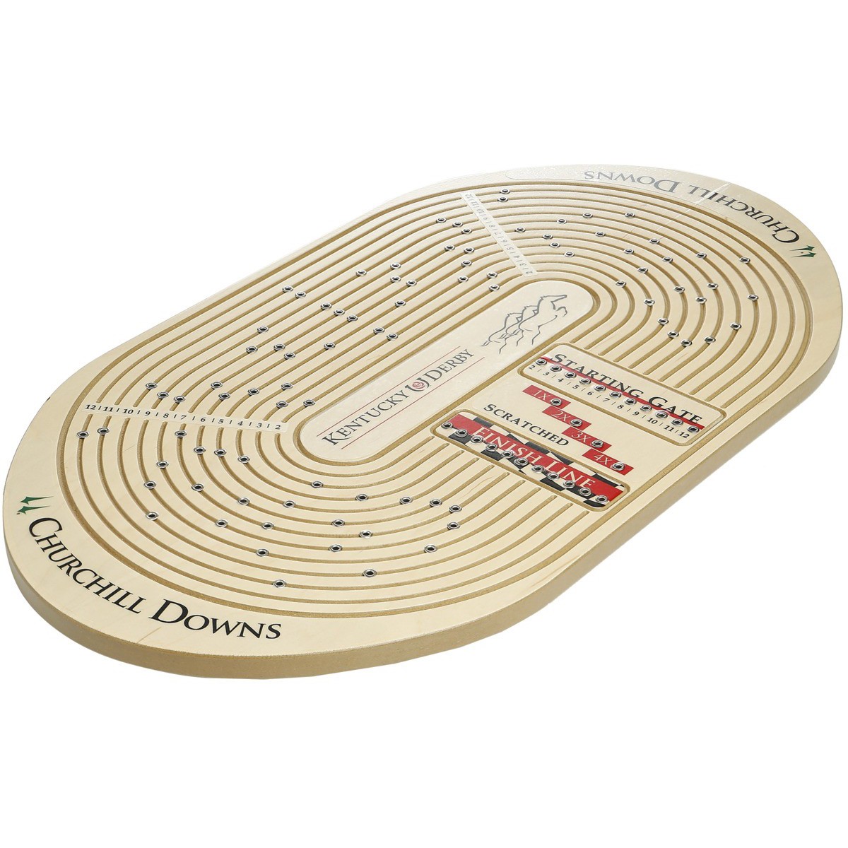 The game board is a maple wood veneer playing surface built for longevity. Metal eyelets are inserted into each hole to protect the game for decades of entertainment. Breathe easy, the game is finished with an environmentally friendly water- based clear acrylic. Our Kentucky Derby horseracing game includes a deck of cards, pair of dice and eleven numbered horses. Approximate dimensions are 15 ½″ x 28″ x ¾”. Game weighs nearly 8 lbs.