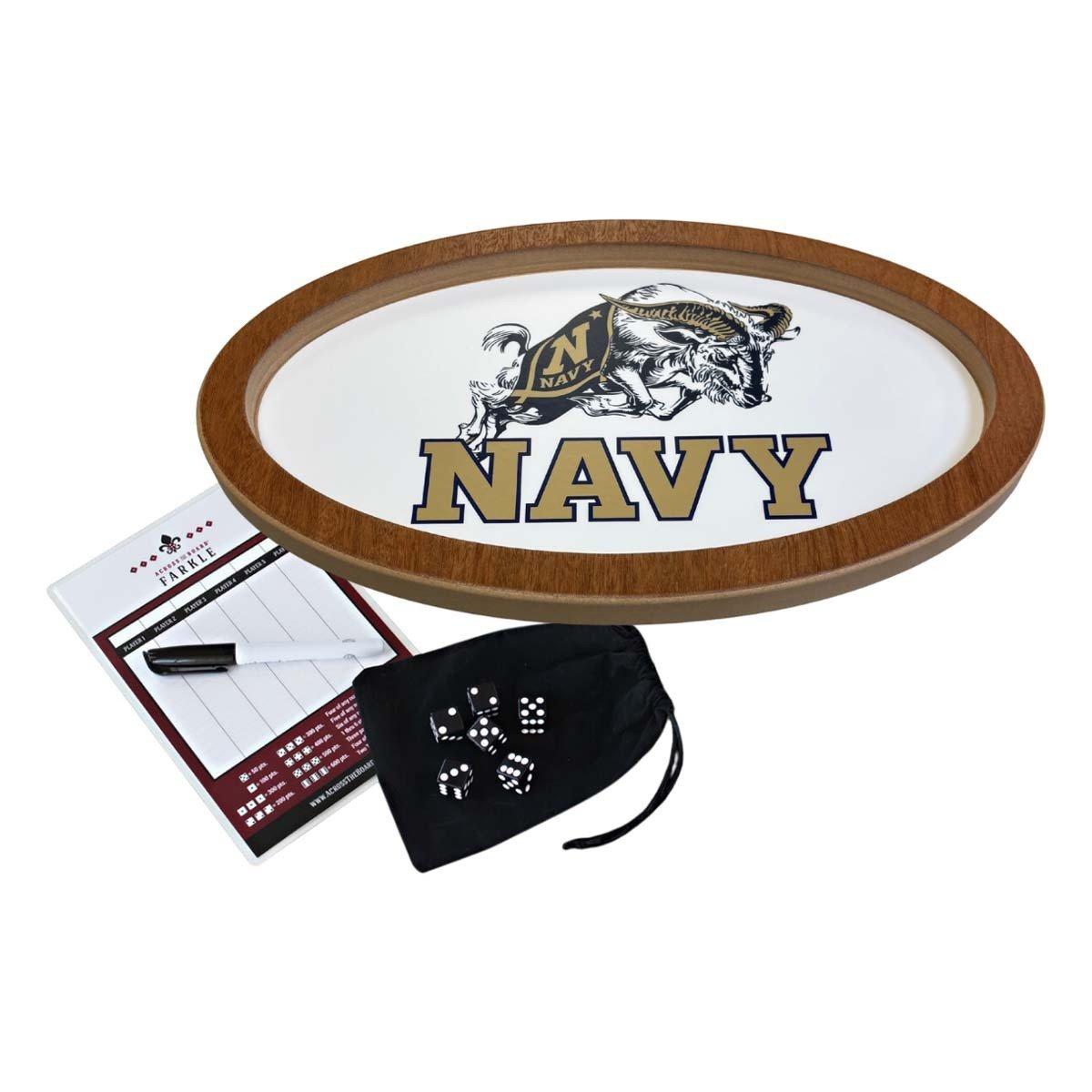 NAVAL ACADEMY FANS..... Farkle game is a simple and fun dice game that has been handed down for generations. The first player to score 10,000 points wins! Choose when to risk more points and when to save your points. This is so much more than a game. Use this as shelf decor, valet tray, or unique display!