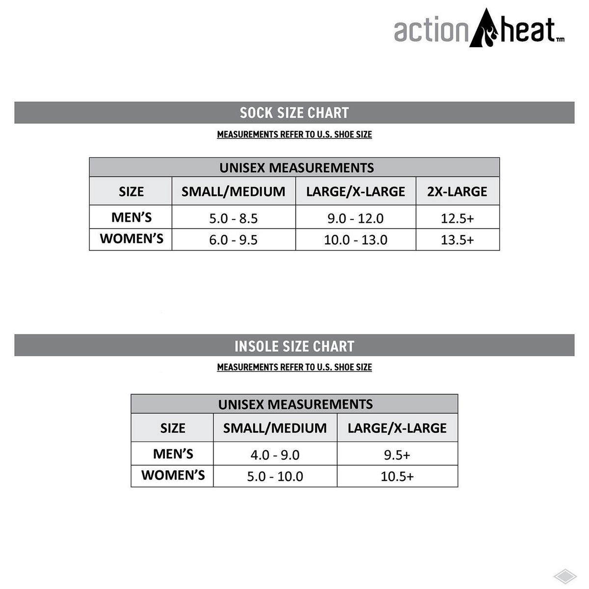Welcome to the most powerful heated sock on the market! The ActionHeat 5V Premium heated socks have the highest tested performance of all ActionHeat items. The ActionHeat 5V battery heated socks are the perfect blend of quality and comfort. The Rechargeable ActionHeat socks reach a maximum temperature of 150F and can last up to 5 hours.