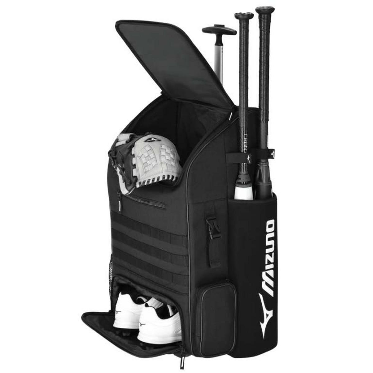 Elevate your game with the NEW Mizuno Pro Wheel Batpack, the ideal companion for baseball and softball players. This well-designed batpack offers features that make your time on the field more convenient. Safeguard your valuables, stay organized with the spacious main compartment, and carry up to four bats. With heavy-duty wheels and a telescopic handle, you can easily transport your gear, while a ventilated cleat compartment keeps your cleats fresh. Use the exterior loop buckle for securing your glove or helmet. The Mizuno Batpack ensures you're always ready to excel on the field