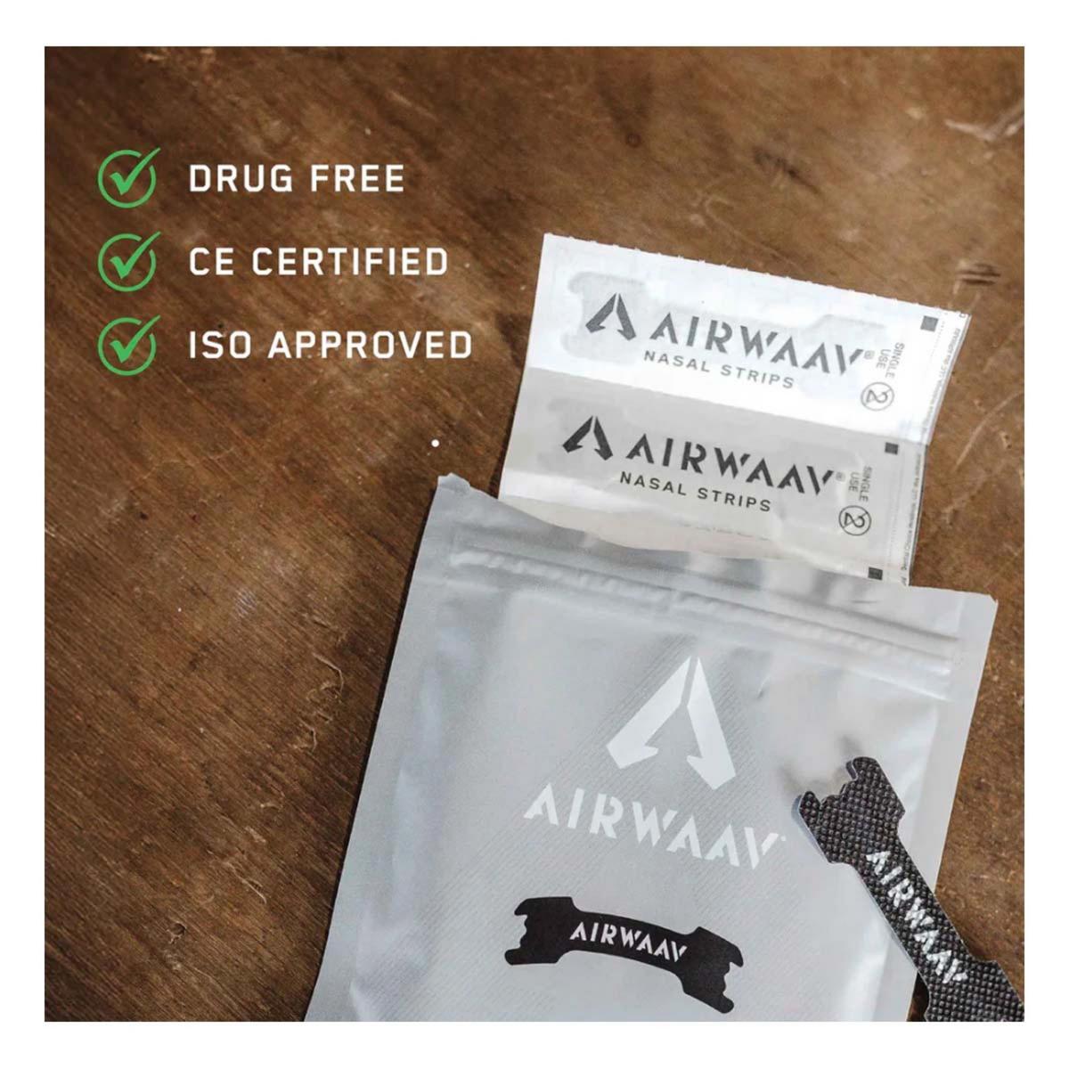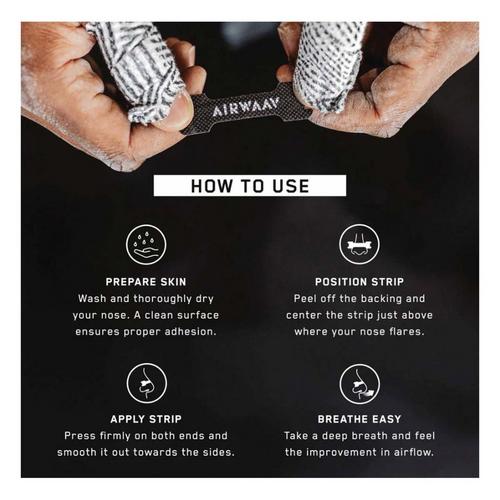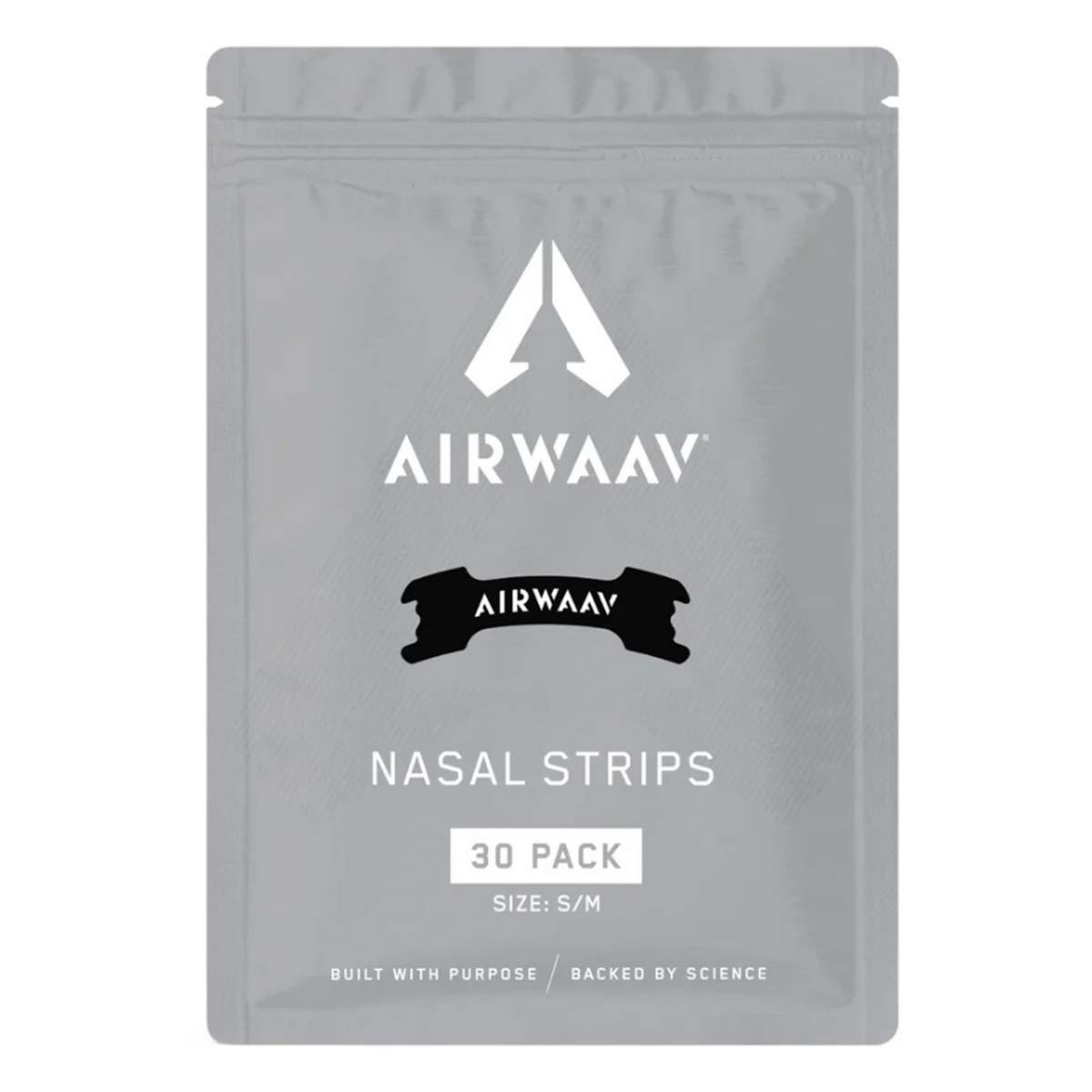 {"reviews":[],"offset":0,"limit":10,"total":0,"gtin":"810180630764"}"Full Description:\nThe AIRWAAV Nasal Strips open nasal passages for smoother, more efficient breathing, helping you perform stronger, recover faster, and breathe better in every moment.\n\nFeatures:\n\u003cul>\n\u003cli>Enhances breathing efficiency for peak performance\u003c/li>\n\u003cli>Opens airways for deeper, uninterrupted sleep\u003c/li>\n\u003cli>Secure, stay-put design with an 8-10 hour wear time\u003c/li>\n\u003cli>Comfortable fit with quick and easy removal\u003c/li>\n\u003cli>Drug-free, CE certified, ISO approved\u003c/li>\n\u003cli>Pairs perfectly with AIRWAAV mouthpieces\u003c/li>\n\u003c/ul>\n\nSpecifications:\n\u003cul>\n\u003cli>Individually packaged for convenience\u003c/li>\n\u003cli>Compact resealable bag for easy storage and travel\u003c/li>\n\u003cli>Fitting instructions printed on the back of the bag for quick and easy application\u003c/li>\n\u003c/ul>\n"