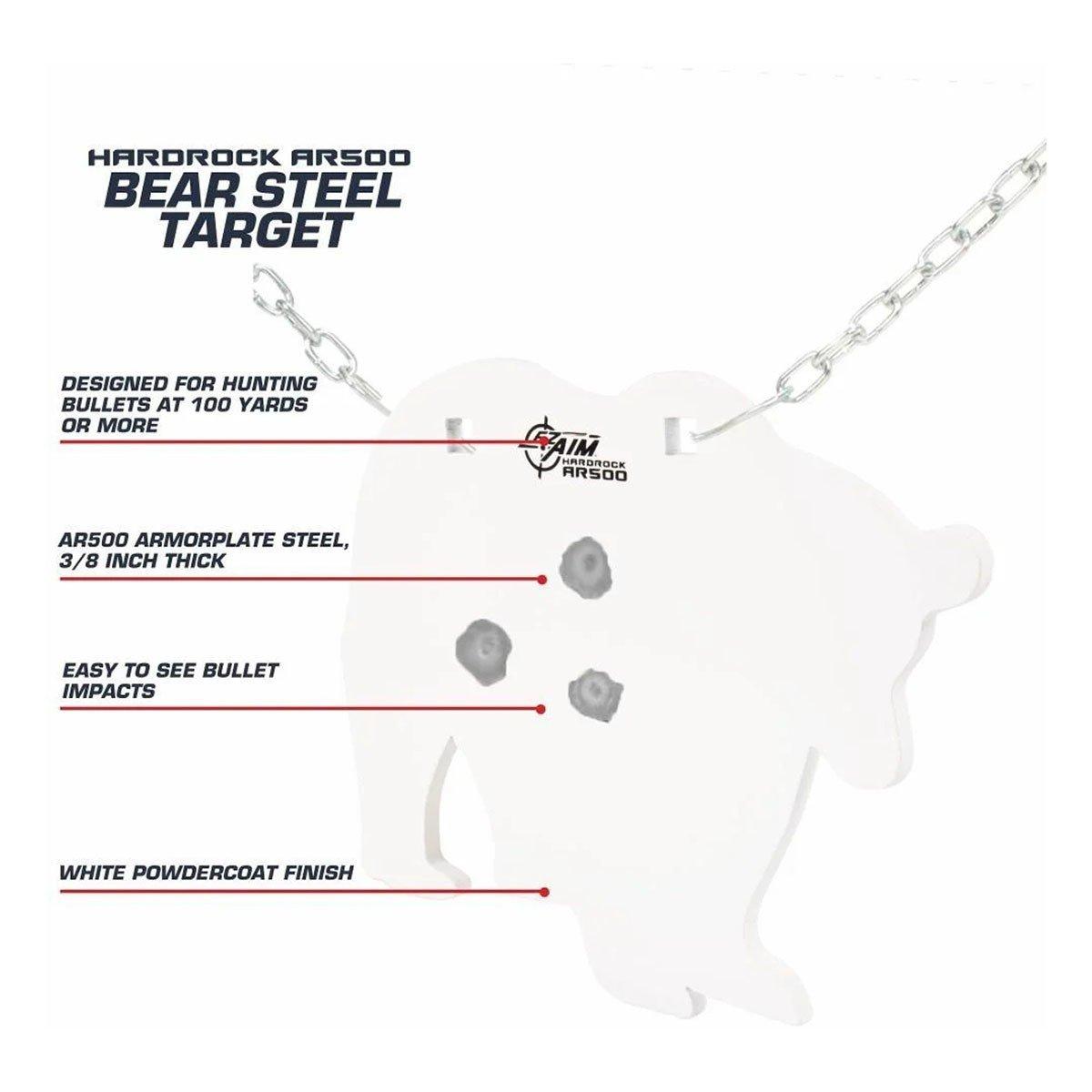 The EZ Aim AR500 Bear Target is designed for use with hunting caliber guns shooting hunting bullets at 100 yards or more. The 3/8 thick Armor Plate steel is designed for rugged use. The gong hanger attachment points are well inside the body to limit failure if hit by a bullet. The white powder-coat finish makes it easy to see bullet impact point. 12 x 10 x 3/8 thick.