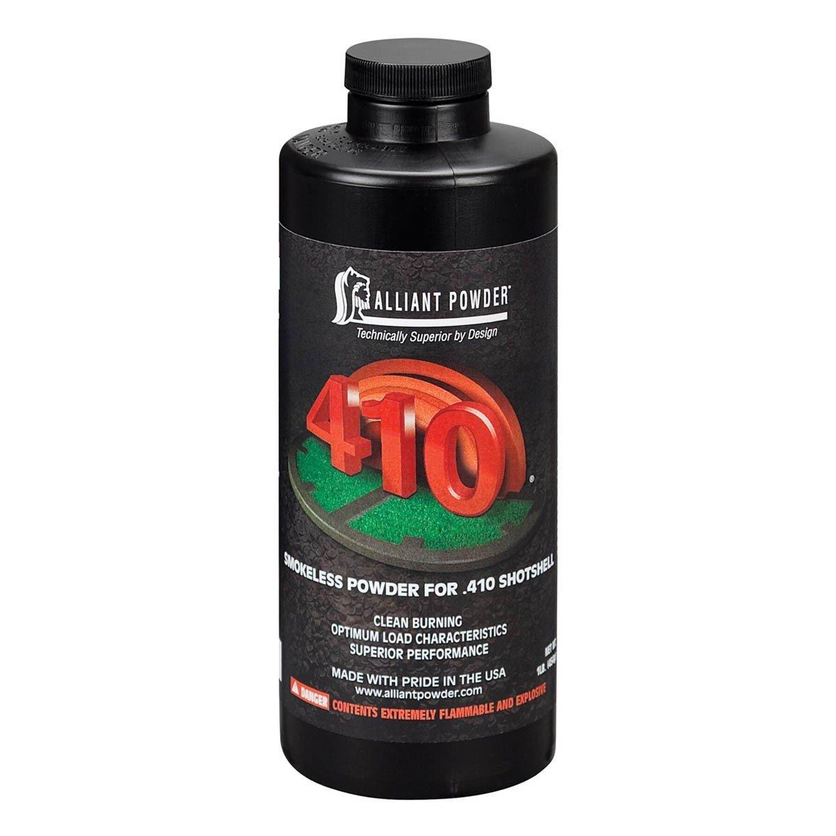Alliant Powder's new 410 is the only flake powder specifically designed for the exacting needs of .410 skeet and field loads. Being the cleanest burning .410 powder available, this new 410 is more efficient, with lower powder charge weights, providing optimum loading characteristics. The superior ballistic performance of 410 creates perfect patterns. Consistent performance in any weather, shot after shot, lot after lot, makes the new 410 your reloading powder of choice.