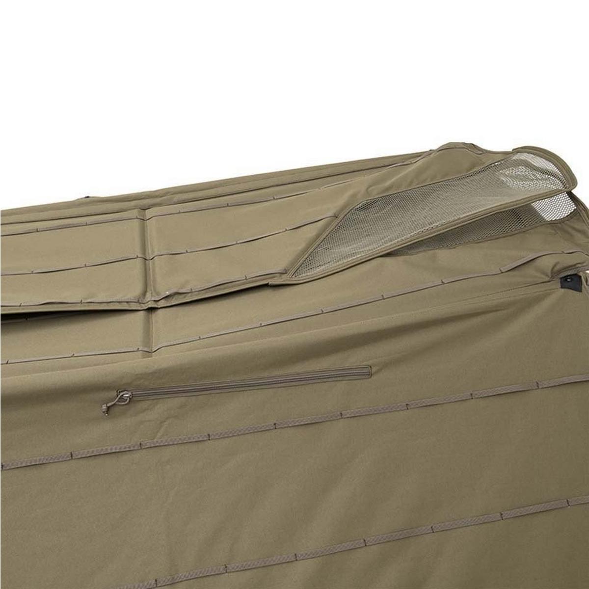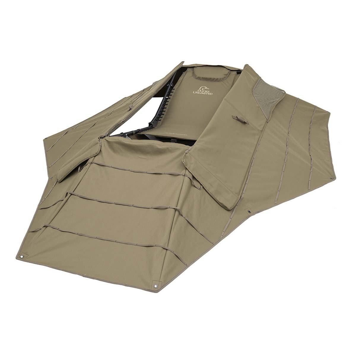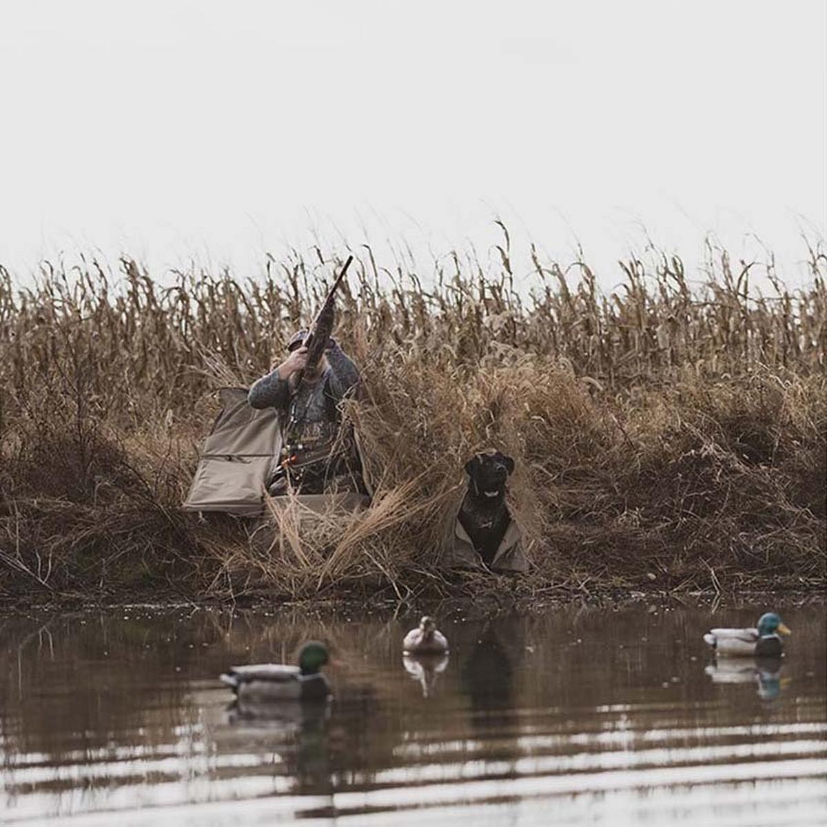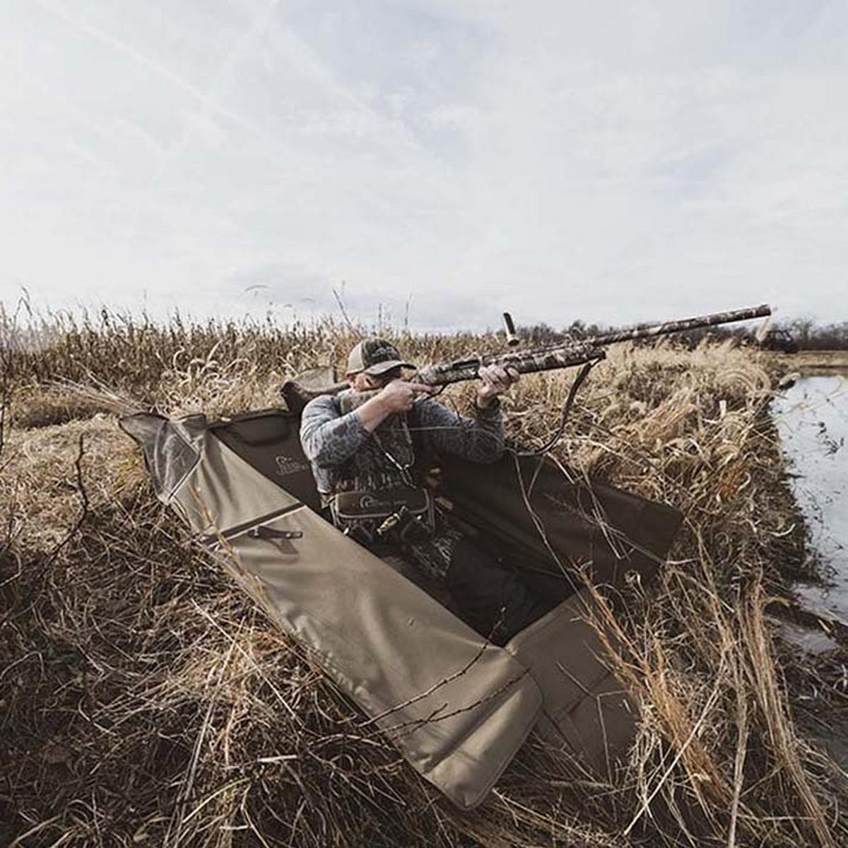 The most comfortable & most effortless layout blind to set up is available on the market today. Period. The Zero-Gravity Layout Blind requires no assembly and boasts an array of features that make it durable, comfortable, portable, sturdy, and reliable. Utilizing a zero-gravity chair design that keeps you off of the ground while also maintaining a low profile, you'll never go back to your old layout blind again. The fabric flares out on all sides to help make concealment easier and allows for storing bags or other accessories in the blind. Backpack carry straps make transporting the blind a breeze. There isn't a floor in the blind, which makes cleaning up quick and easy. The blind also includes two side gear pockets for extra items, brush loops throughout for added concealment, heavy duty threaded stakes for frozen terrain, and a padded headrest for maximum comfort. The cockpit has an opening dimension of 24" by 56" and features two zippered flag ports next to the doors.