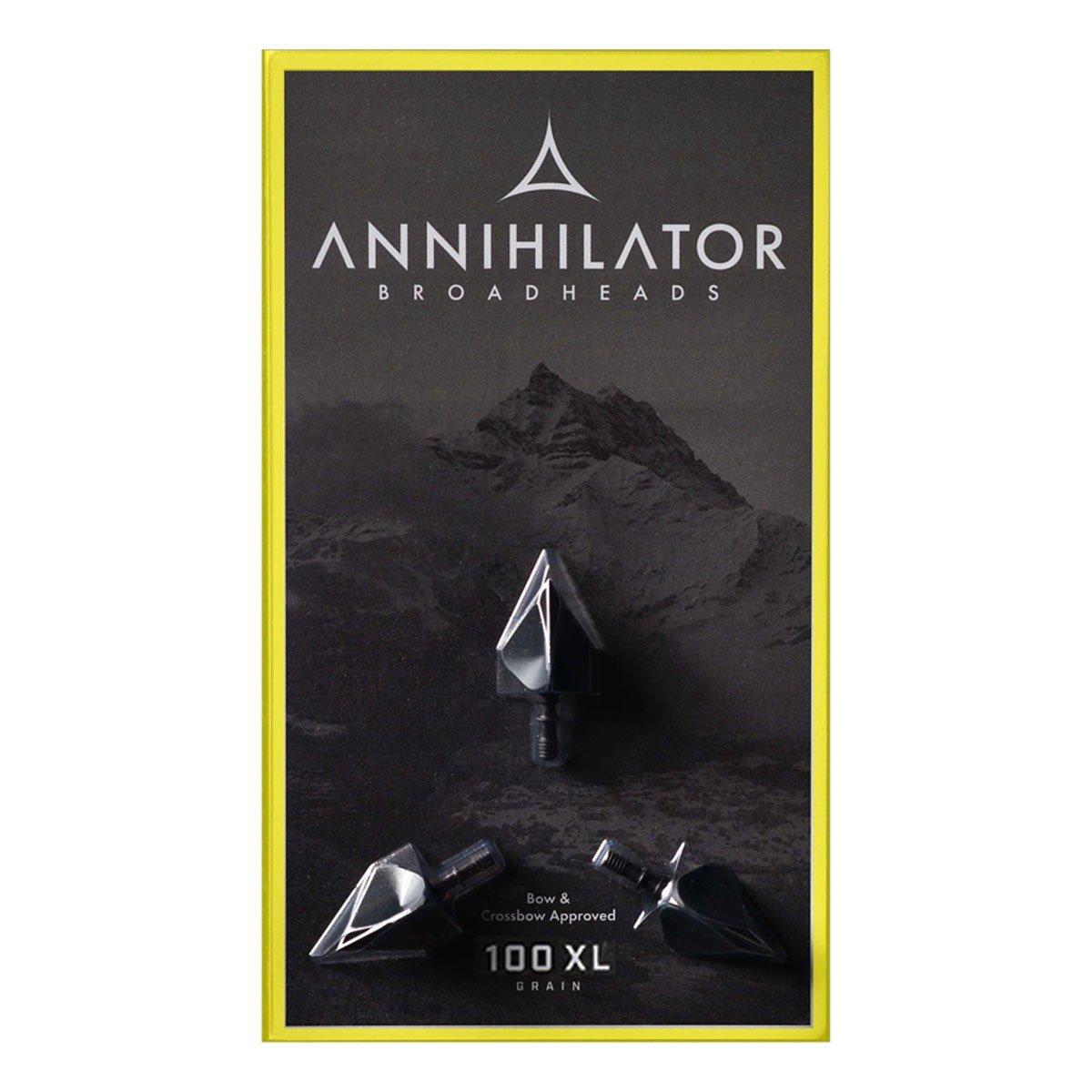 Annihilator Broadheads are engineered to fly like field points, be nearly indestructible, pass-through animals, and increase lethality over other designs. The Annihilator is a new shape defining an evolution in broadhead efficiency to ethically take game with a bow or crossbow.