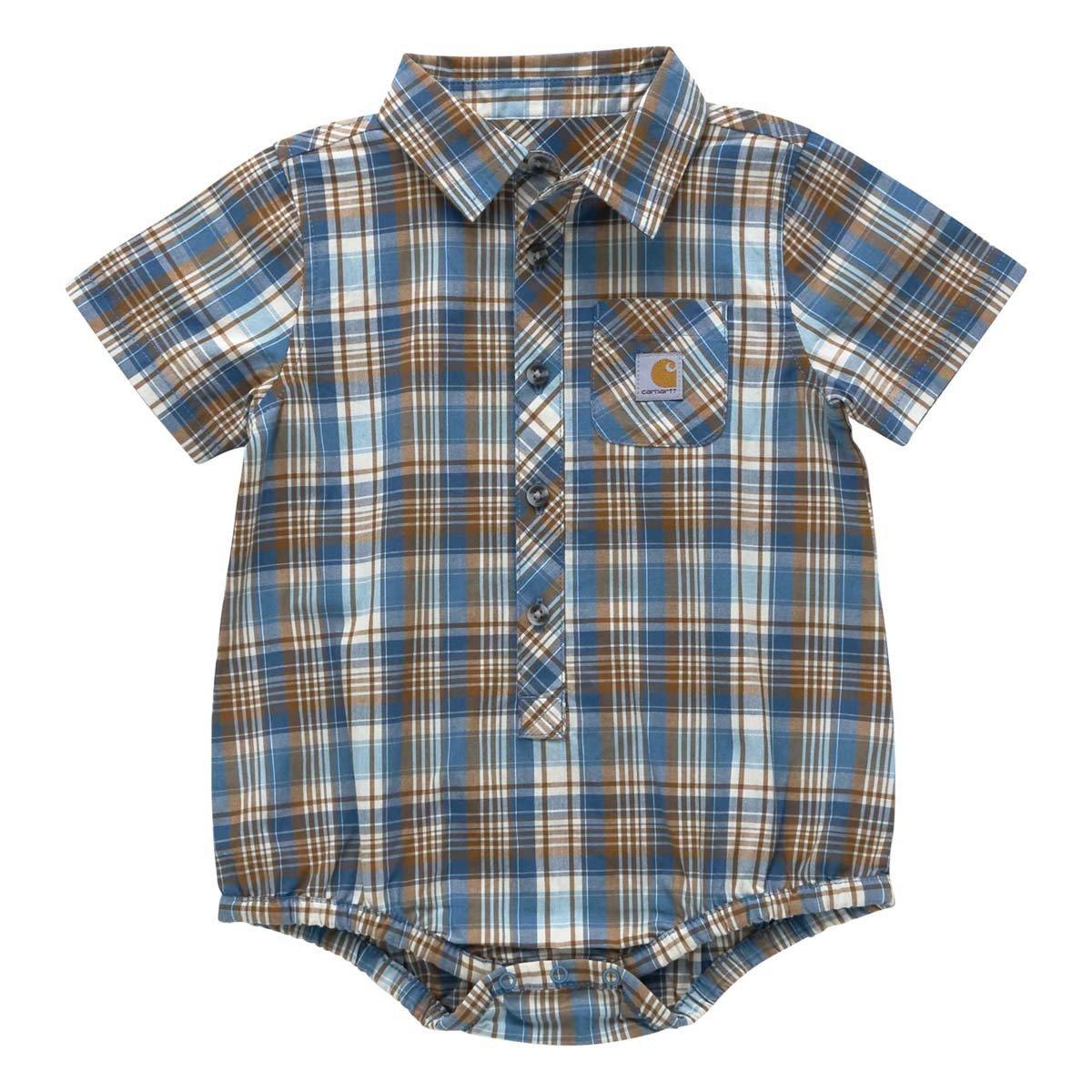 Your little one will be comfy and stylish in this Carhartt bodysuit for baby boys that can keep up with everything, whatever is dished out. Classic work-shirt styling is ready for anything. Convenience features and durable fabric make this a go-to for active adventures.