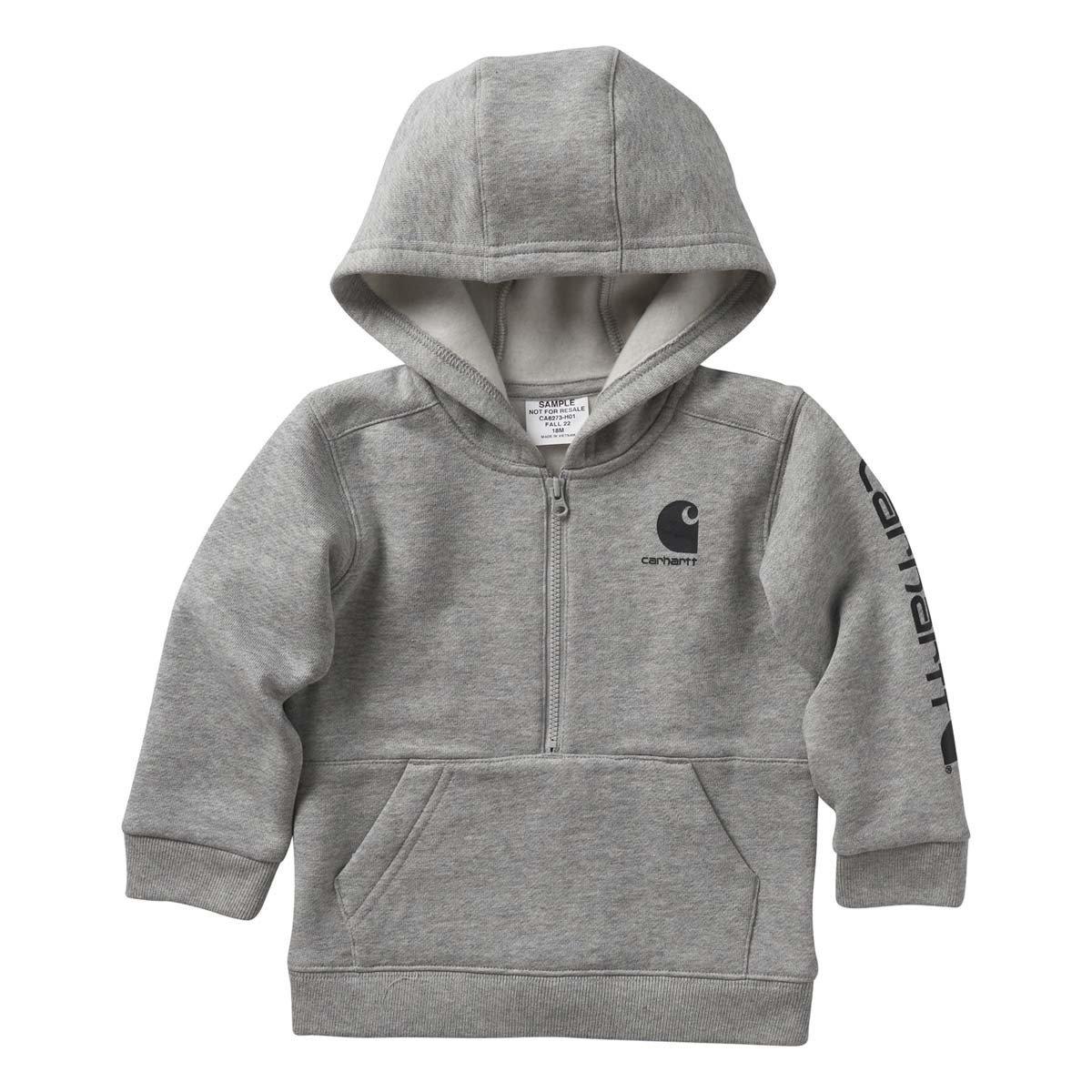 The Carhartt 1/2 Zip Fleece Hoodie is a must-have layer for your little one's wardrobe. The Carhartt 1/2 Zip Fleece Hoodie is made with a durable blend of cotton and polyester. The Carhartt logo is proudly displayed on the sleeve and chest and a half-zip closure makes for easy on and off. Get your little one ready to brave the cold with the Infant Carhartt 1/2 Zip Fleece Hoodie.