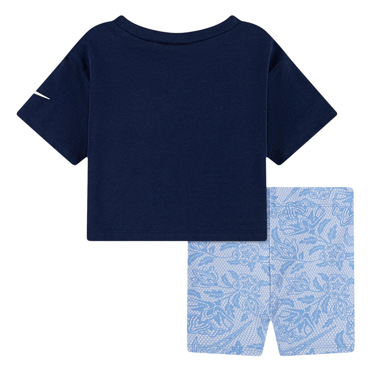 Get your child laced in cool, sporty style with this graphic set from Nike. The cotton/poly tee has a boxy silhouette with dropped shoulders for a relaxed fit and features the iconic slogan "Just Do It", front-and-center. The bike shorts are made of stretch cotton/poly jersey finished with an allover lace inspired graphic print with a stretch waistband for a fit that feels just right.