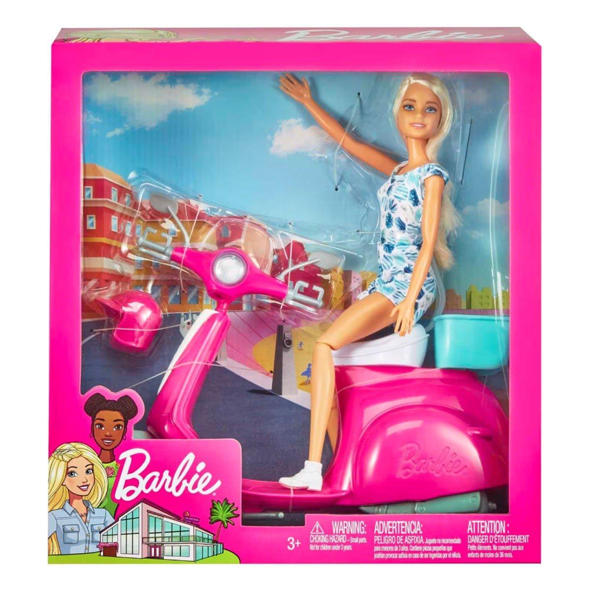 Barbie doll gets playtime rolling with a scooter designed to spark imaginations! The pink and white vehicle has a kickstand, a basket on back and wheels that roll -- just push to get the action started. A clip on the seat and handles on the handlebars hold Barbie doll in place for active storytelling, and a pink helmet keeps her safe while riding. Kids will have so much fun exploring the world with Barbie doll and her scooter because when a girl plays with Barbie, she imagines everything she can become! Includes Barbie doll wearing fashion and accessories and scooter with basket and rolling wheels, plus helmet. Doll cannot walk or ride alone. Colors and decorations may vary.