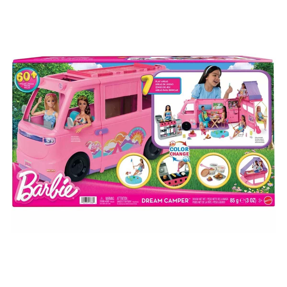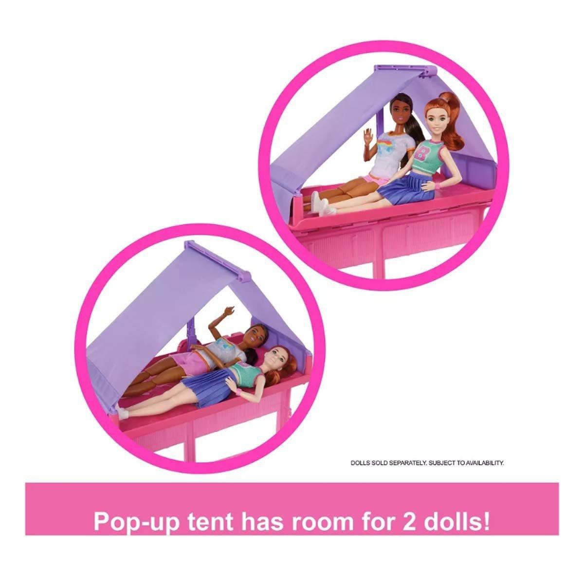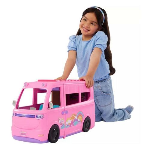 Adventure awaits with the Barbie Dream Camper! Features a rooftop tent, kitchen, firepit, and more for endless outdoor play. Roll into fun with transforming spaces and dreamy accessories!