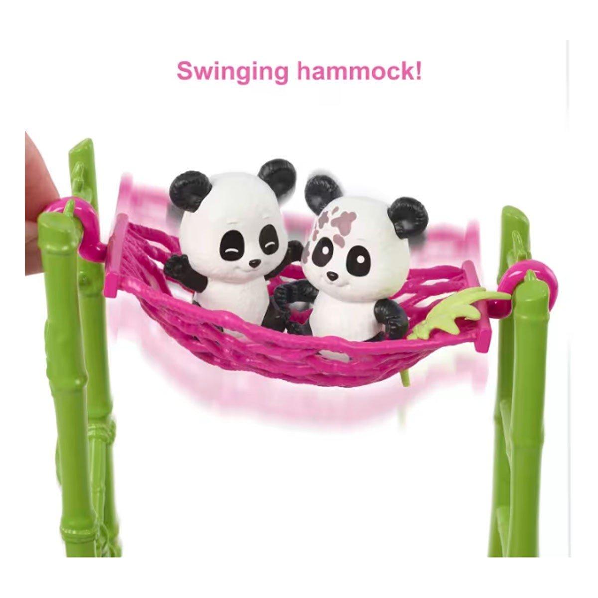 Barbie® Baby Panda Care and Rescue™ playset lets kids explore their adventurous and nurturing sides with a vet Barbie® doll devoted to panda rescue! With two baby panda dolls -- both with color-change transformation -- and 20+ themed accessories, this careers playset inspires imaginations. Three areas of play, including a clean-and-care station, slide and hammock help take care of all panda patient needs. Kids will love the storytelling fun and ability to dream big! Doll cannot stand alone. Colors and decorations may vary.