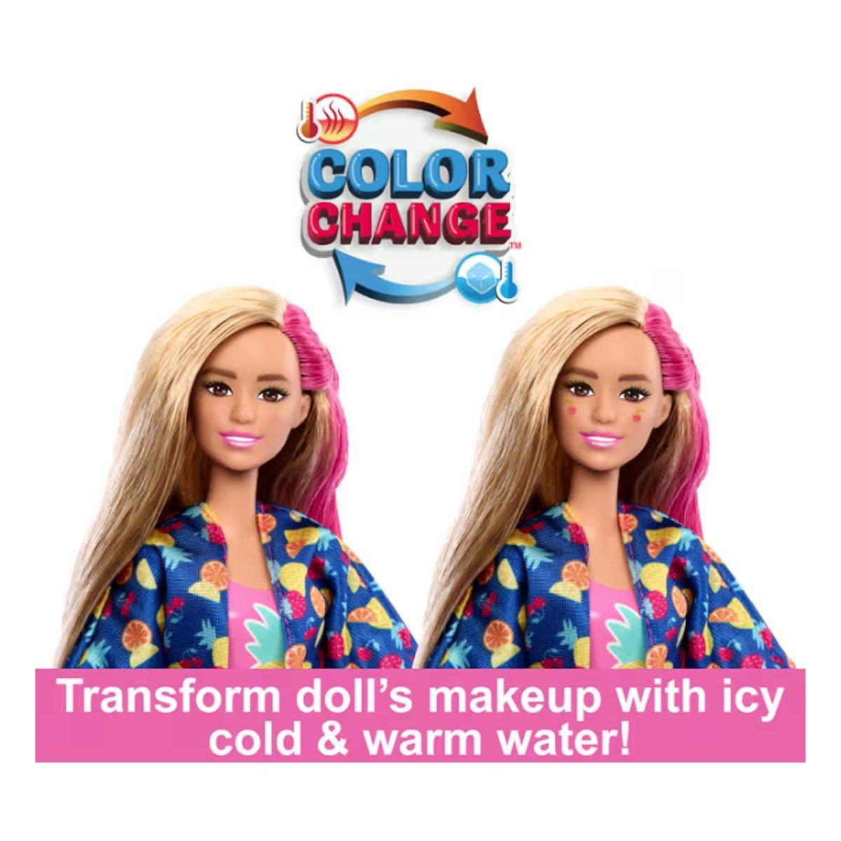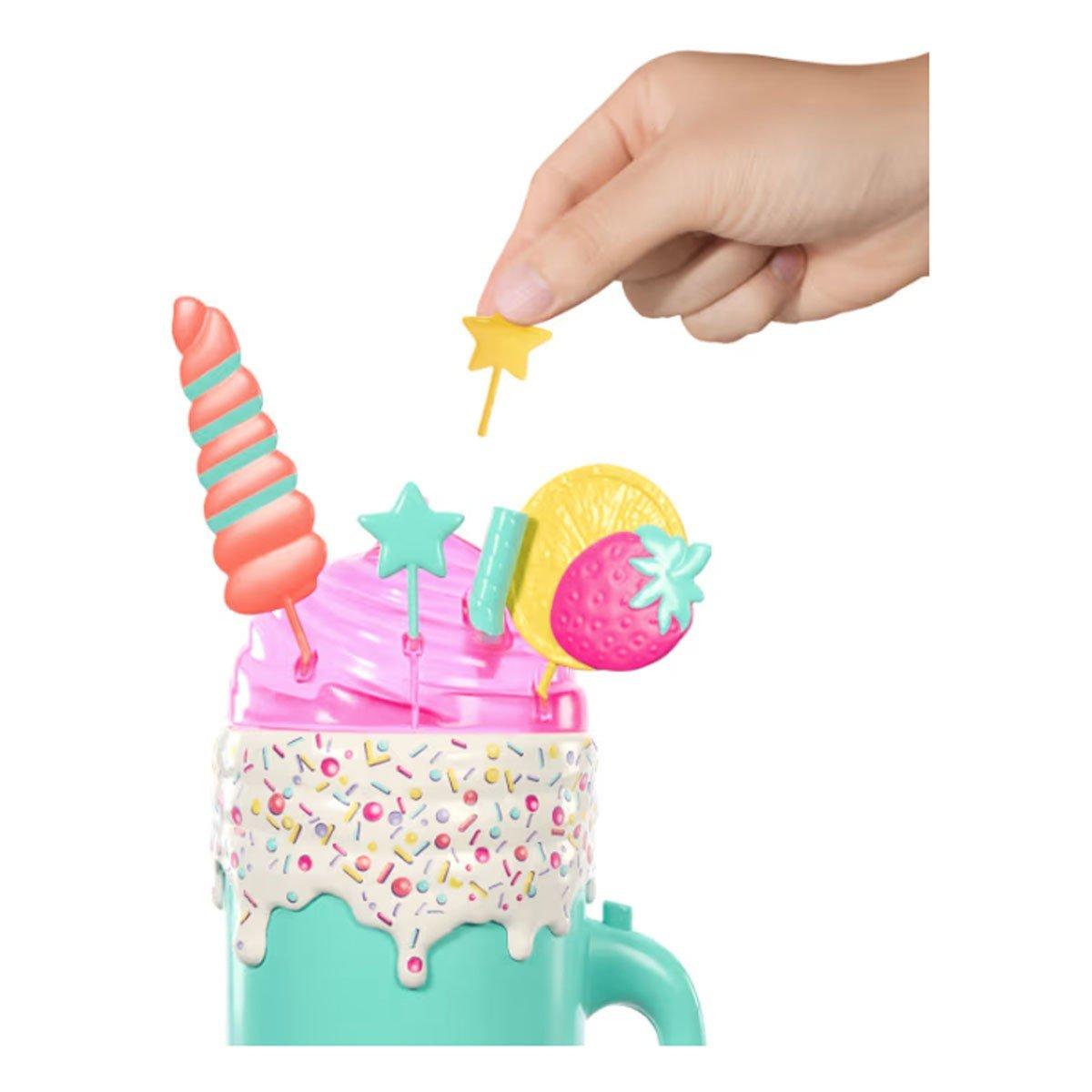 With the Barbie Pop Reveal Rise and Surprise doll and accessories gift set, playtime really pops! Unbox 15 surprises including a scented Barbie doll with color-change makeup, a scented squishy pet, moldable sand, fashions and storytelling accessories. Unwrap, lift the cup lid and press the button on the handle to watch Barbie doll rise to the top -- repeat the wow moment again and again. Pop the ice cubes open and discover the surprises inside; they're reusable for more repeat fun! Mystery bags hold additional accessories. There's a fruit-print cover-up, pair of shoes, floaties, a bag of moldable sand and more. Style Barbie for a day of fun in the sun and switch up her look with color change on her face. Kids will love discovering all the possibilities for play in this surprise-filled gift set! Doll cannot stand alone. Colors and decorations may vary.