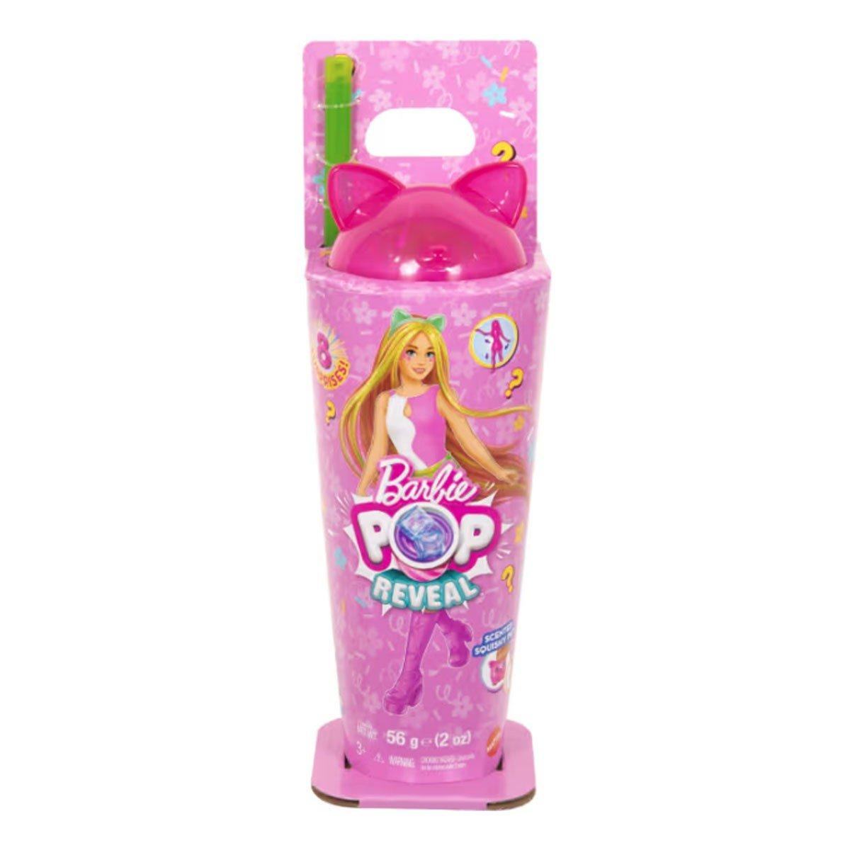 Barbie Pop Reveal Shakes Series dolls offer a sensory opening experience with eight surprises inside a shake-inspired cup! Unscrew the animal ear lid with the shimmery Slime and poke through the film with the straw for squishy fun. Peel the film on the cup to reveal a shake-scented Barbie doll and seven more surprises! Which doll will you reveal? There's a Sweet Unicorn, Cute Kitten or Bright Bunny. Continue opening to discover two reusable ice cubes that pop open to reveal a skirt or pair of shorts and a pair of shoes or boots. Mystery bags reveal a squishy, scented matching pet, a pet bed and an animal ear headband! Discover more wow with a color-change transformation on Barbie doll's face. Kids will want to collect them all! Each doll sold separately, subject to availability. Dolls cannot stand alone. Colors and decorations may vary.