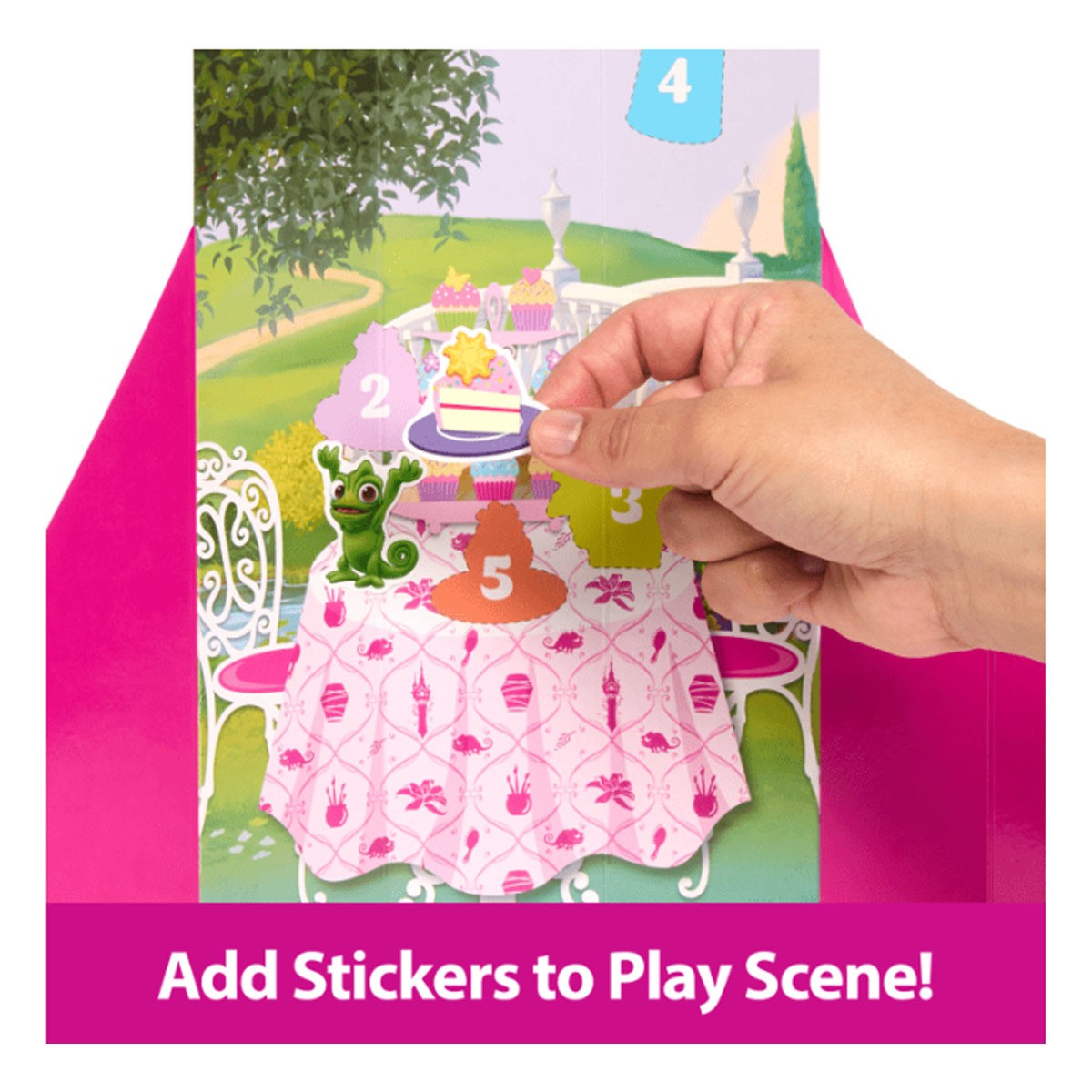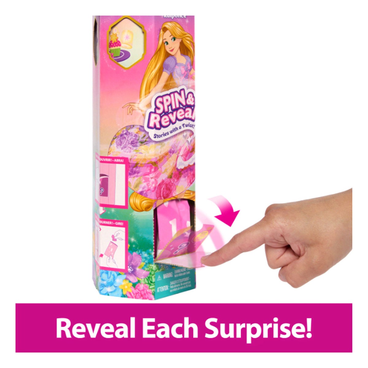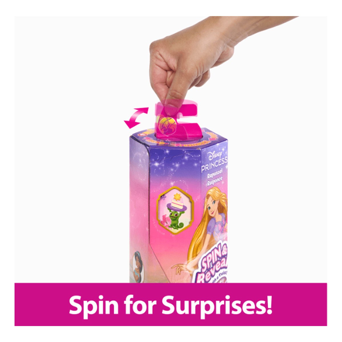 Disney's Rapunzel gets a magical twist in this Disney Princess Spin & Reveal unboxing experience! First open the flower to reveal a play scene with mystery silhouettes. Next spin the package to find 5 mystery bags filled with 5 accessories and 5 stickers. The final reveal is a Rapunzel fashion doll in a beautiful floral outfit! A reversible skirt and snap-on bodice extend the fun, plus kids can decorate the play scene and imagine stories with it as a backdrop. Doll cannot stand alone.