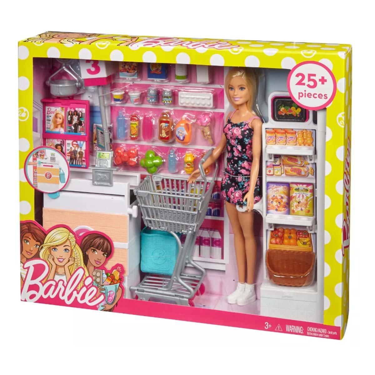 Barbie® doll has all the ingredients for fun with a grocery store playset has everything needed to play out a trip to the supermarket! Pieces are designed with working features (like wheels on the cart and a working conveyor belt at the register) along with modern trends for realistic role-play and imaginative storytelling. Help Barbie® doll grab the shopping cart -- it really rolls! -- and browse the display stand, with its bin for produce, shelves for food and a scale that moves for active role-play. Once the cart is full, head over to register 3. Load the items onto the conveyor belt and place the shopping bag on the hook; then slide the lever and watch Barbie® doll's purchases fall into the bag. There are so many meals and stories kids can cook up -- especially with 20 food accessories to set up and shop. And a plug-and-play design keeps them in place so imaginations can focus on storytelling and all-day play. Barbie® doll is ready for any adventure in the aisles wearing a sporty floral dress and white sneakers. Kids will love exploring the grocery store and the world with this supermarket playset because you can be anything with Barbie®! Includes Barbie® doll wearing fashion and shoes, checkout stand with register and working conveyor belt, display case, rolling shopping cart, shopping bag and food pieces. Doll cannot stand alone. Colors and decorations may vary.