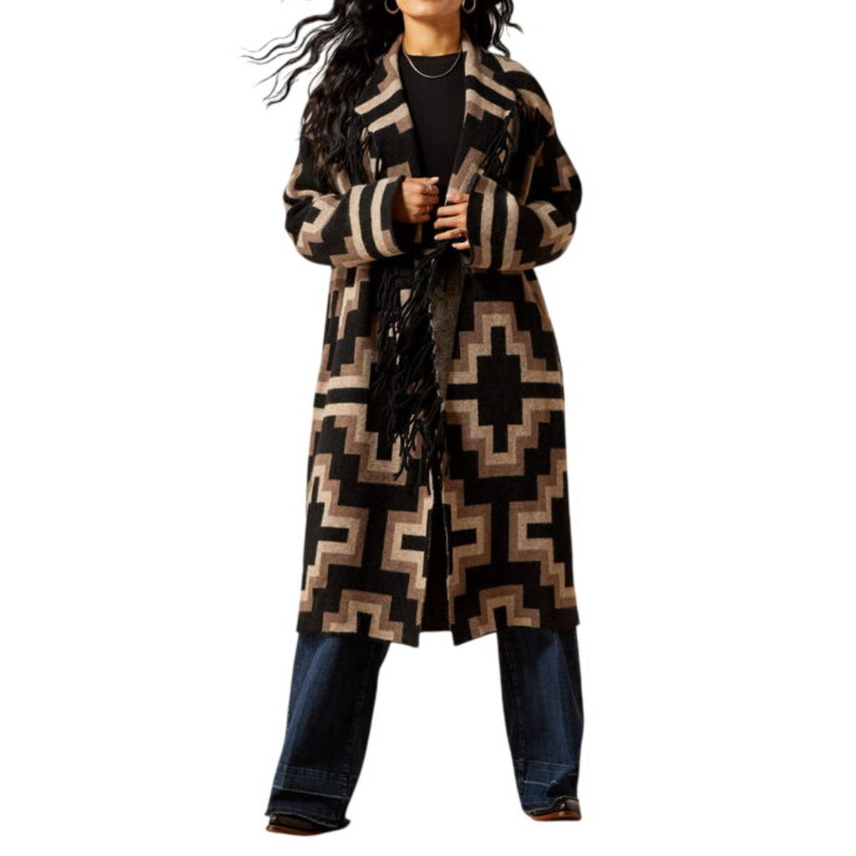 When the coat *is* the outfit. Crafted from soft knit, this chic layer blends an eye-catching Southwestern pattern with a fringe-lined shawl collar for a showstopping style moment.
