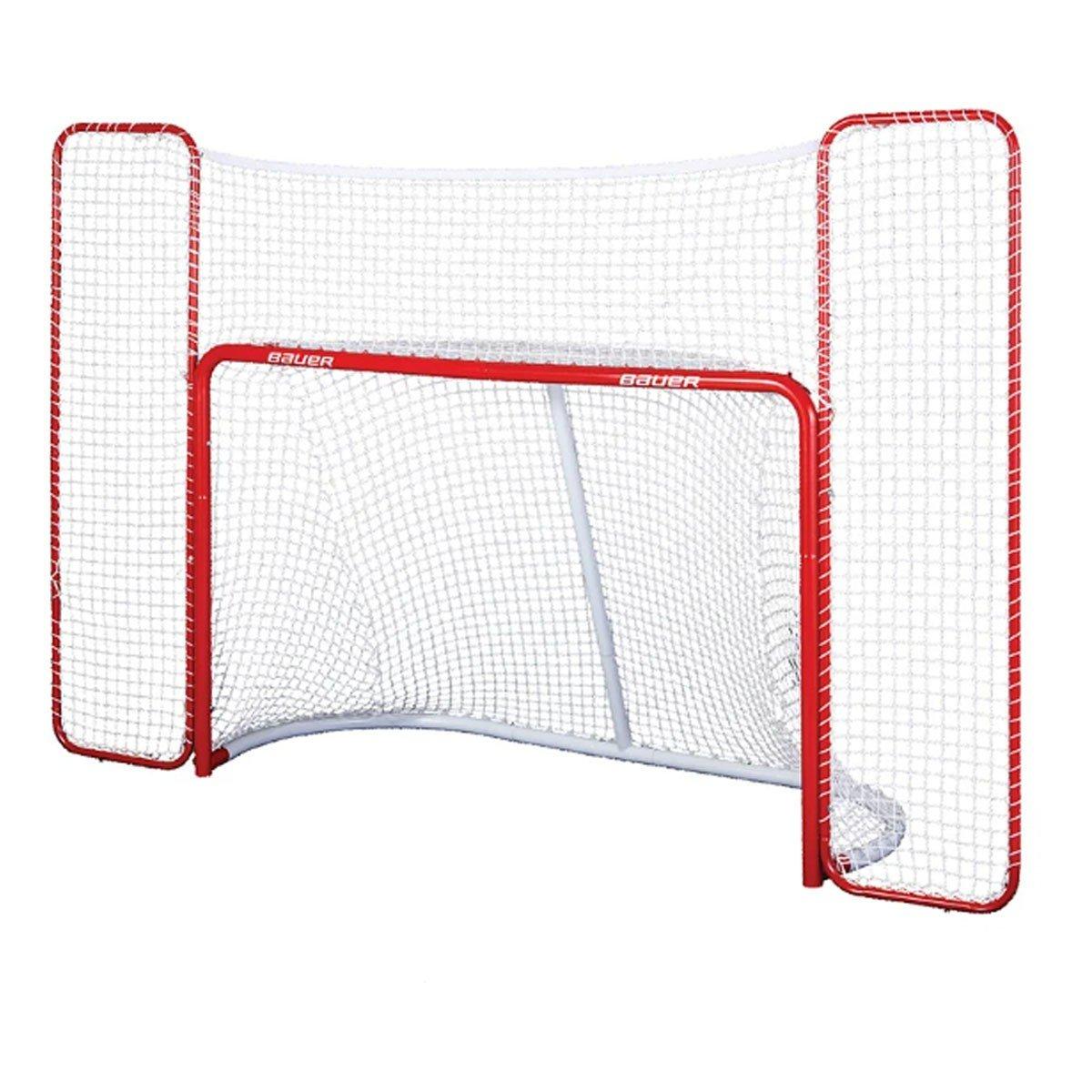 The Bauer Official Performance Steel Goal with Backstop features a regulation-sized 6'x4' robust goal with a backstop rebounder that keeps stray pucks from damaging garages, windows, cars, and so on. The backstop extends out 19.5" on each side of the net and adds 22" of coverage above the crossbar.