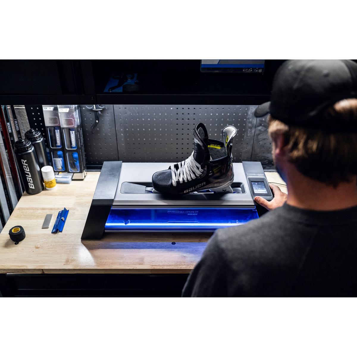 There’s been a revolution in at-home skate sharpening. The PROSHARP BAUER ADVANTEDGE skate sharpening machine gives everyone the ability to sharpen their skates with precision at the touch of a button. With automated sharpening, clamping, and entry and exit points, you can take the guesswork out of the equation and get consistent, accurate results every time your blades need sharpening.