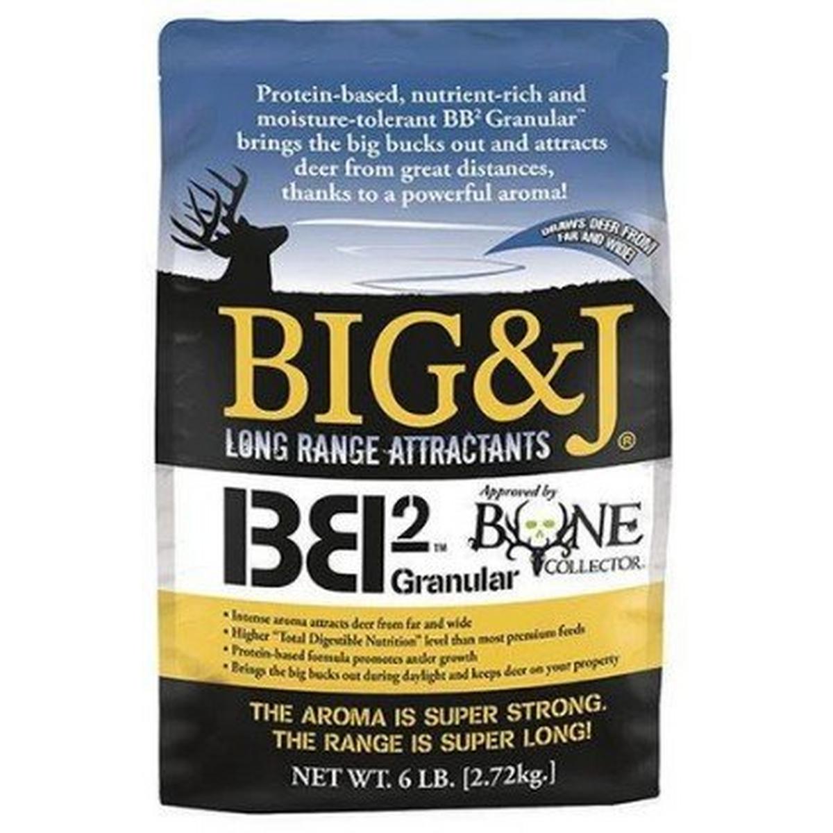 Attractants are only as good as the distance deer can smell them. BB2™ Granular from Big & J is a long range attractant. BB2™ Granular utilizes a proprietary refining process to make a nutrient--rich protein--based formula that has an intense aroma that will attract more deer from further away. This allows you to compete with neighbors who have food plots and bait sites. Deer crave the nutrient--rich formula so they keep coming back. And the protein promotes antler growth. BB2™ also comes in handy during preseason to establish travel patterns and acclimate deer to your area as well as during the season to attract deer to your property and/or stand site. It's also ideal for attracting deer to camera sites. 6lb bag.