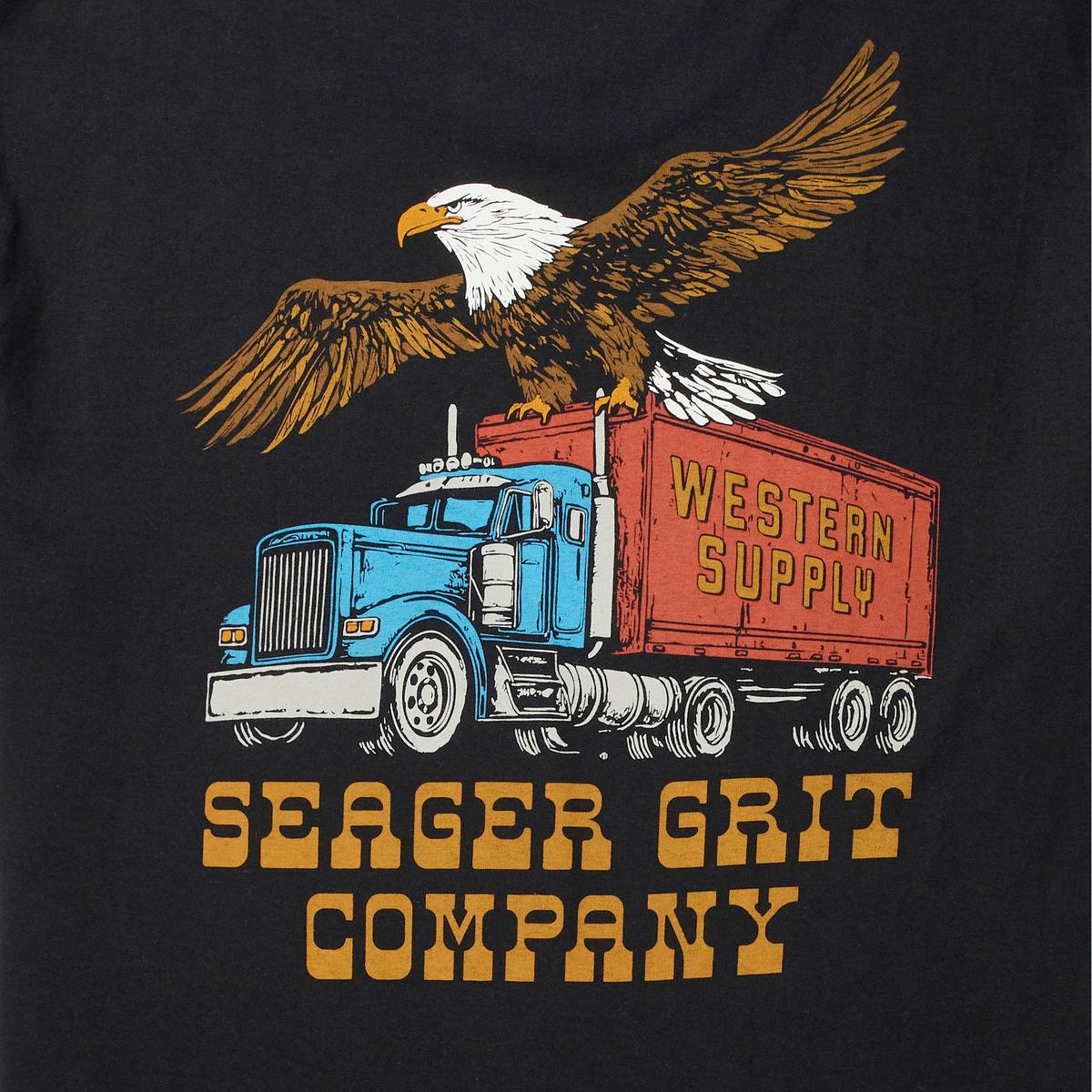 Elevate your casual wardrobe with the Men's Seager Co. Big Rig T-Shirt, a perfect blend of comfort and rugged style. Crafted from premium, soft cotton, this tee ensures all-day comfort while the durable fabric withstands the tests of time and adventure. Featuring a bold, eye-catching graphic of a classic big rig, it pays homage to the spirit of the open road and adds a touch of Americana to your look. Whether you're hitting the road or relaxing at home, this versatile t-shirt is an essential addition for those who appreciate both quality and style.