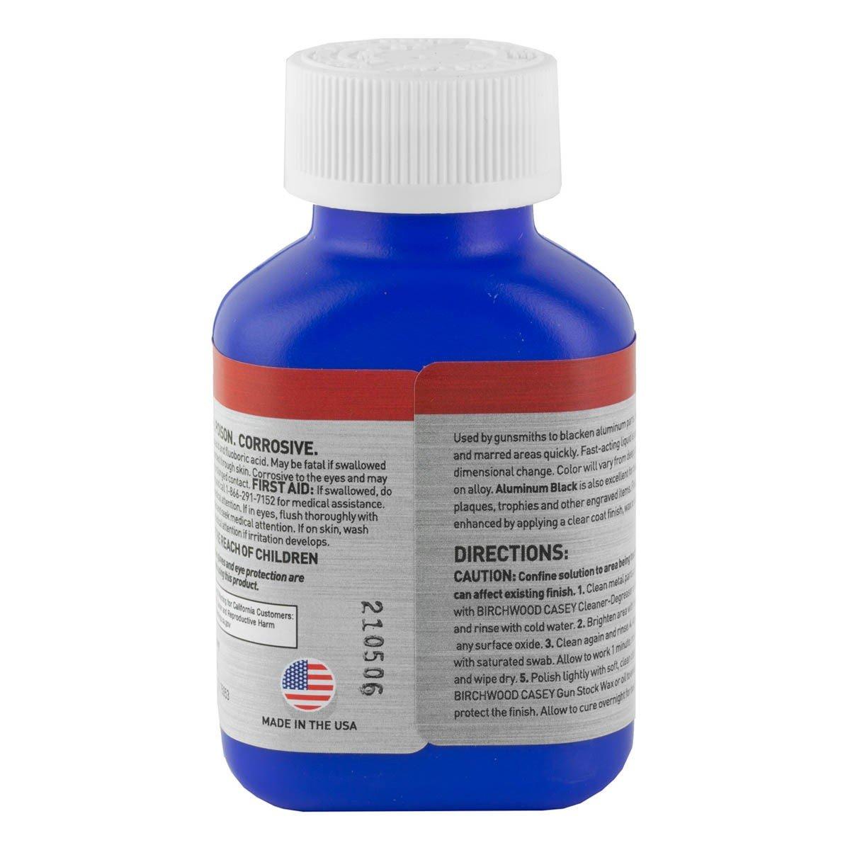 This is the room temperature chemical used by gunsmiths and industry to blacken aluminum parts. Restores scratched and marred areas quickly. Fast-acting liquid is easy-to-apply with no dimensional change. Color will vary from deep gray to black depending on alloy. Aluminum Black Metal Finish is also excellent for blackening name plates plaques trophies and other engraved items. 3 oz. container