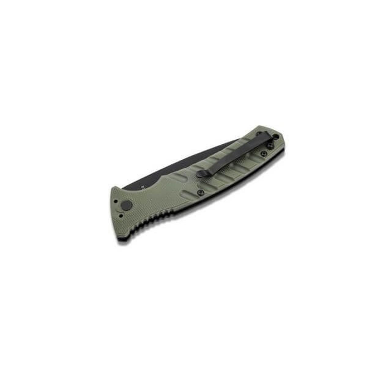 The ergonomic handle is constructed with milled green Grivory scales over solid steel liners, combining low weight with outstanding durability and grip security. Deep jimping in the thumb recess ensures confident handling, even under pressure.