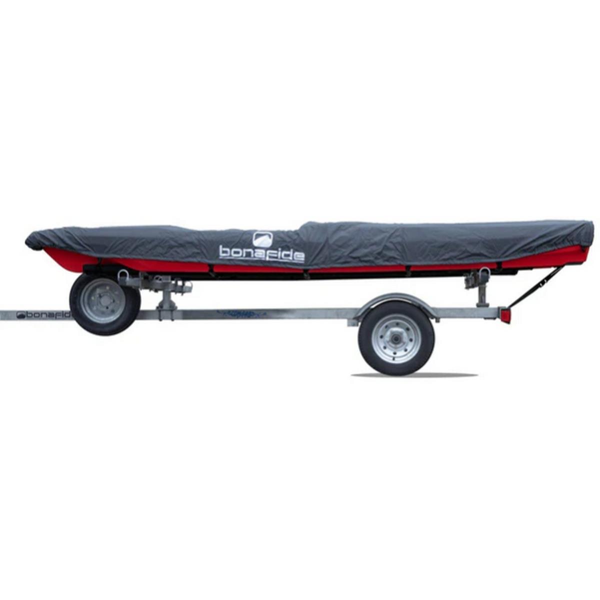 Bonafide Kayak Covers are custom made to fit our kayaks just right. Each cover includes a full set of cover tie down straps (one for each loop set - 5 or 6) that can be used to secure the cover when traveling through the sewn in loops on the cover. All covers are made in USA and created with marine-grade anti-wick thread that includes double-stitched construction and 4-ply join seams.