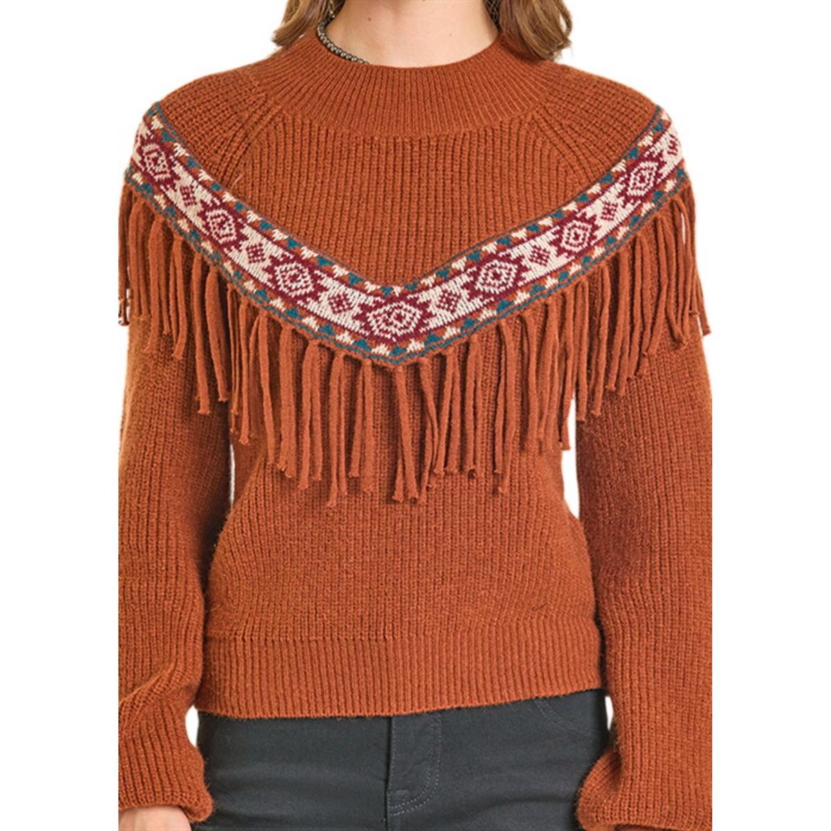 Women's Rock & Roll Denim Border and Fringe Pullover Sweater