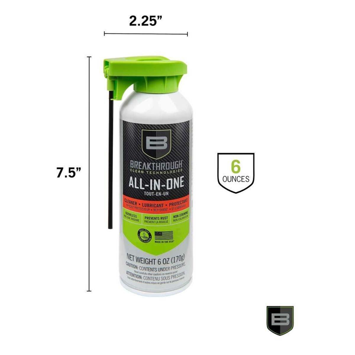 The Breakthrough Clean Technologies® Aerosol All-In-One (CLP) is an aerosol variant of our All-In-One (CLP) and is part of our newest collection, the Aerosols Series, designed to give you more control over your cleaning. Aerosols are designed to be more user-friendly, allowing the user to have a more accurate application of the chemicals. The Aerosol All-In-One (CLP) is a multi-use cleaner, lubricant and protectant, designed for quick maintenance between thorough cleanings to help keep your firearm running smoothly. The cleaning part acts as a degreaser, removing oil, grease, and carbon build-up from the action of your firearm. It also operates as a lubricant and a protectant reducing friction and wear while protecting your firearm from rust and corrosion. Providing limitless usability, the aerosol cleaner, lubricant, and protectant can be used on tools, automotive, metal, locks, knives, bicycles, or items found in your home that are subject to corrosion damage. It minimizes the friction and prevents degradation from metal-to-metal contact of your equipment for optimum future use. The Breakthrough Clean Technologies® Aerosol All-In-One (CLP) is odorless, safe to use and is made in the USA.