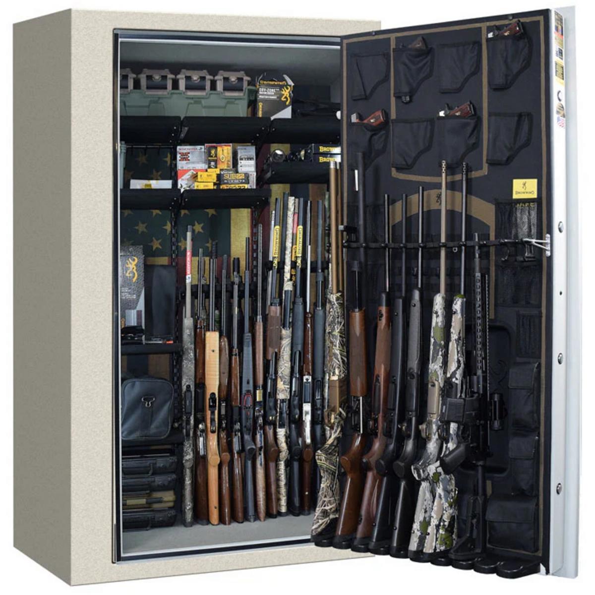 You’ll be ready to master every hunt with a superior storage system crafted right here in America. The Hunter Deluxe adds a full DPX door panel, including two Scope Savers, a factory-installed LED light kit, and distinctive metal tags on the door, including an American flag. A flag also adorns the back wall panel. Confidently store up to 49 long guns behind a 12-Gauge steel body, nine 1” chrome locking bolts, a Force Deflector Locking System, and more premium security features. With adjustable wood shelving and a Quick Access Barrel Rack, the hunt never has to wait.