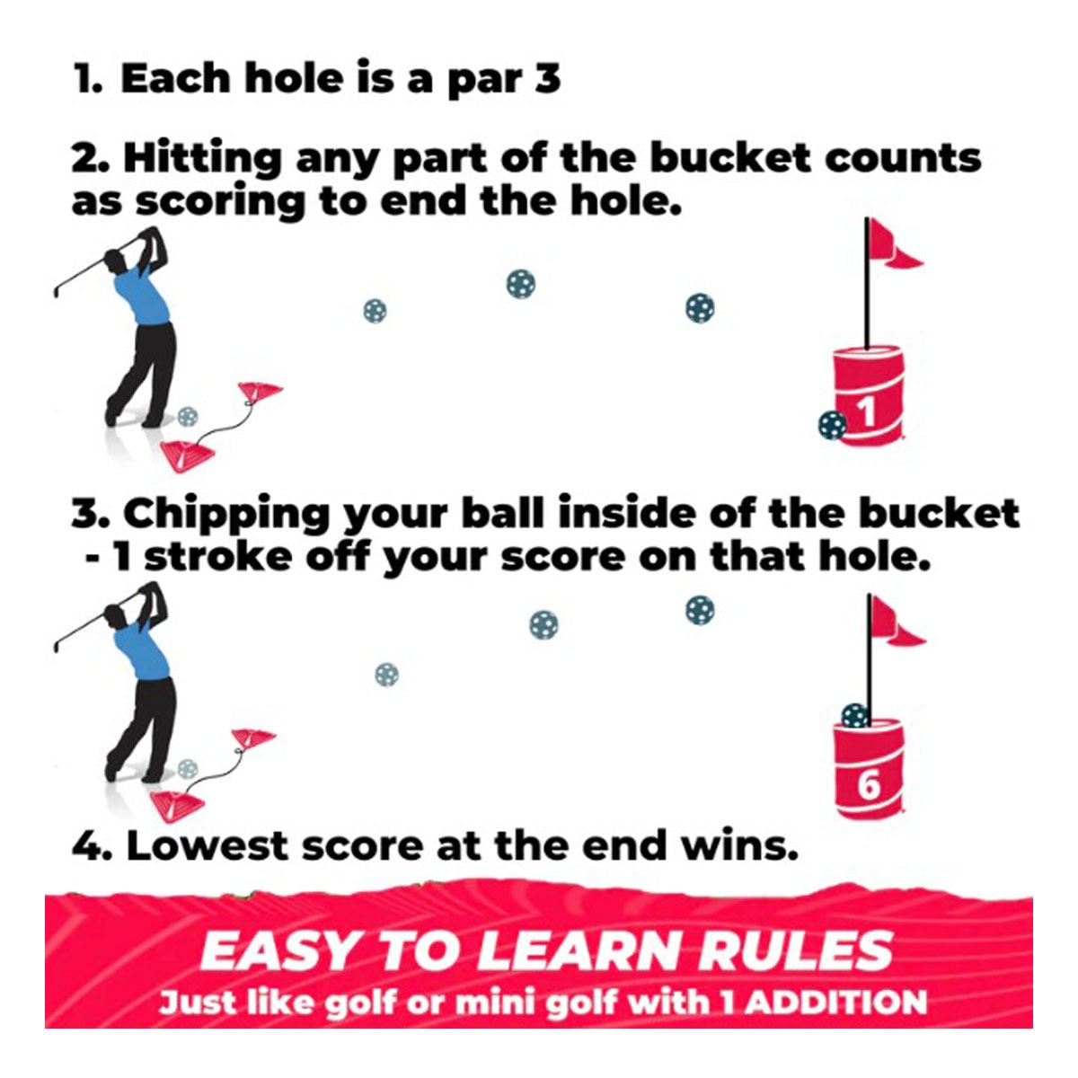 Introducing the BucketGolf Game! Get ready to take your golf game to the next level with this innovative and exciting game. This unique game combines all the elements of a classic game of golf with the added challenge of shooting into buckets instead of traditional golf holes. The object of the game is to make it in the buckets in as few shots as possible.
