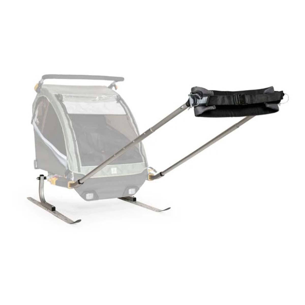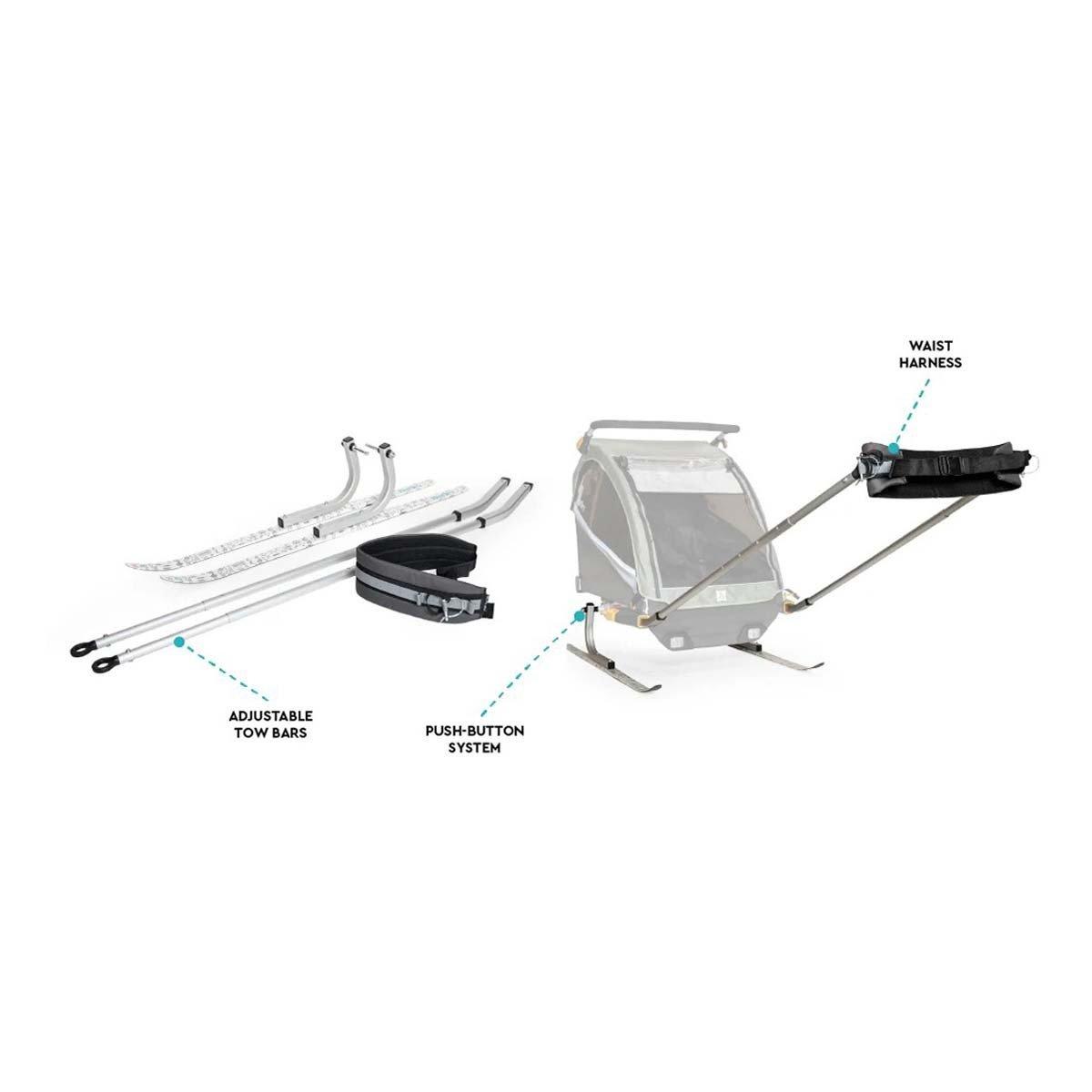 Equip your bike trailer for year-round exploration with this snowy weather conversion kit. Over the river or through the woods, the Ski Kit lets you easily tow your trailer while cross country skiing or snowshoeing. A simple push-button system makes installation quick and easy. The padded waist harness and adjustable tow bars provide a comfortable towing solution for you while the trailer skis help passengers glide over the snow with ease.