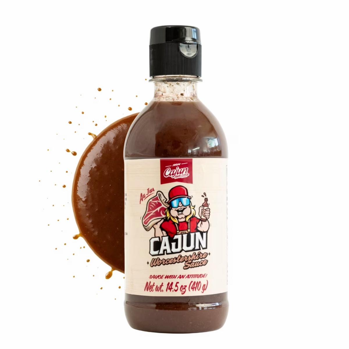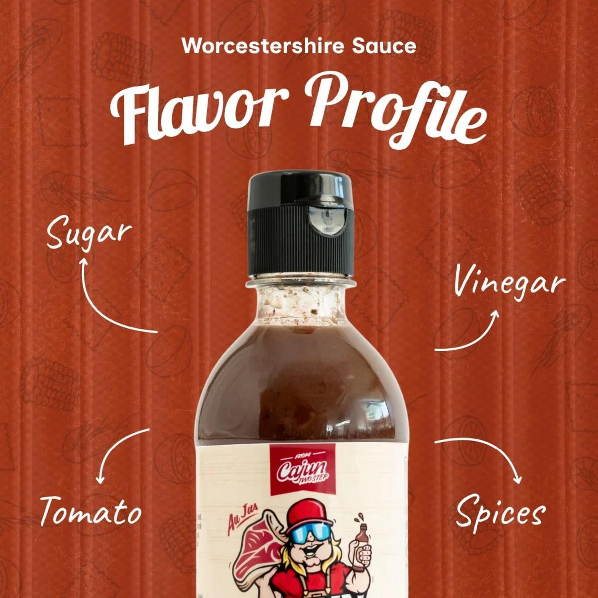 Cajun Two Step Au Jus Sauce Bottle; Dive into the rich flavors of Louisiana with our authentic Au Jus sauce. Crafted with a perfect balance of savory spices and traditional Cajun flair, Cajun Two Step Au Jus Sauce adds depth and character to any dish. This Au Jus sauce will elevate any dish you may have, and is a great alternative to any Worcestershire sauce you may be using now. No MSG in this product.