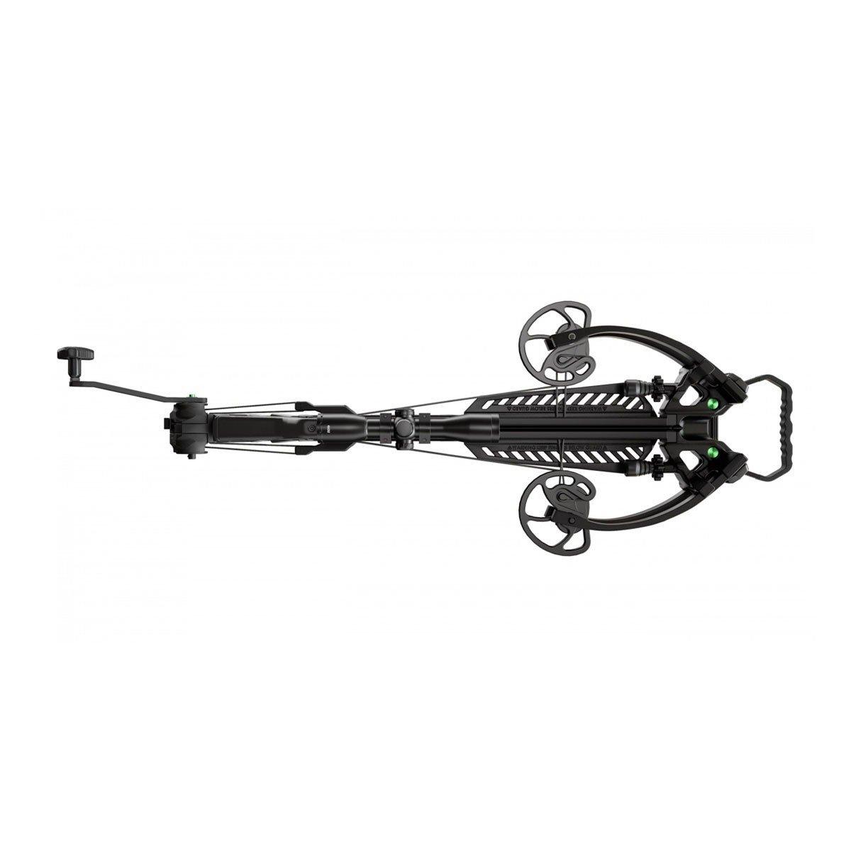 - Includes a 4x32mm illuminated scope, three 20” 400-grain carbon arrows with field points, detachable quiver, and rope cocker