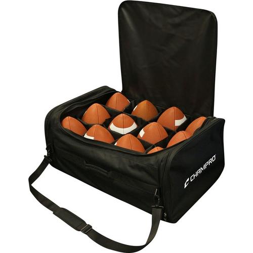 The Champro Football Carry Bag has a spacious main compartment that holds 12 full-size footballs with a dividing grid to keep each ball in place. It’s also made with water-resistant 600D polyester fabric to create a long-lasting bag that holds up under weight. Two zippered side pockets provide additional storage to keep official’s or coach’s accessories. The side handle and detachable shoulder strap make it easy to lift and carry gear, while the D-shaped opening with dual zippers allows for easy access.
