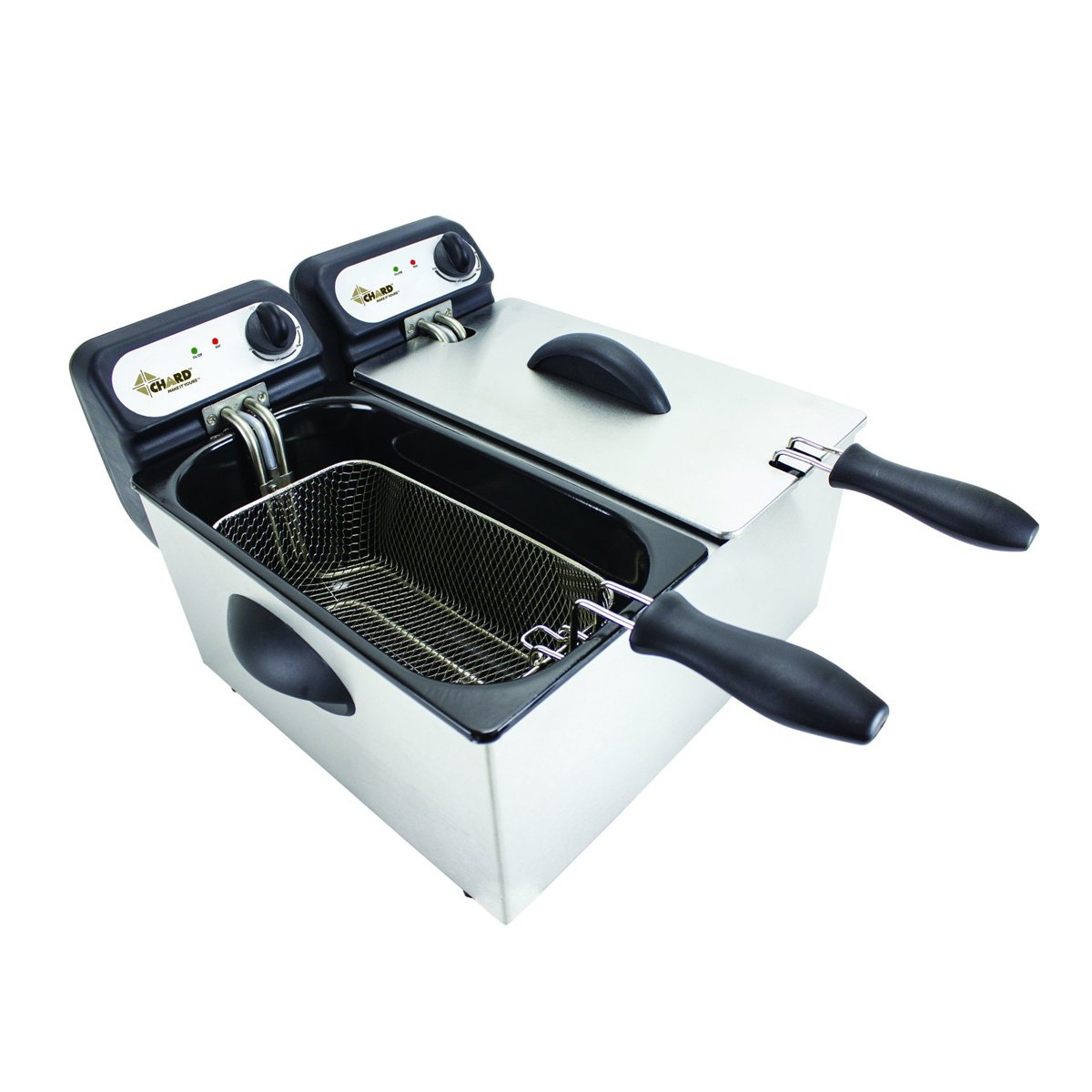 The CHARD Stainless Steel Double Electric Deep Fryer gives you double the capacity and twice the power of a single basket fryer. This CHARD double deep fryer has two three-liter tanks with individual temperature controls so you can cook multiple batches at a time. The cooking baskets have built-in drain hooks so you can drain your food before serving, while illuminated Power and Ready lights let you know when the oil is hot enough to start frying. Plus, the heating elements and control units disassemble from the tank, making this double deep fryer easy to clean. From fish to french fries, fry with twice the capacity using the CHARD Stainless Steel Double Electric Deep Fryer.