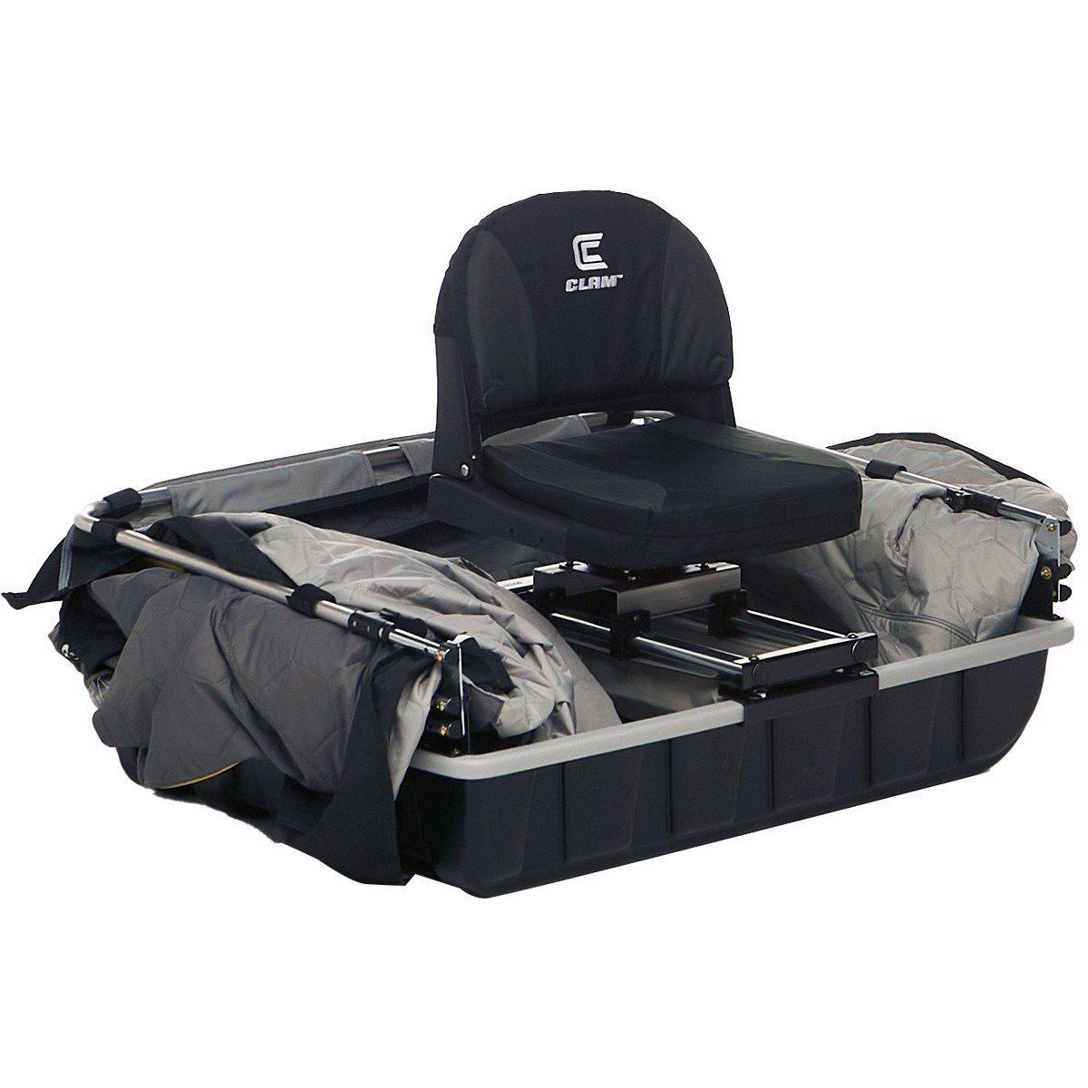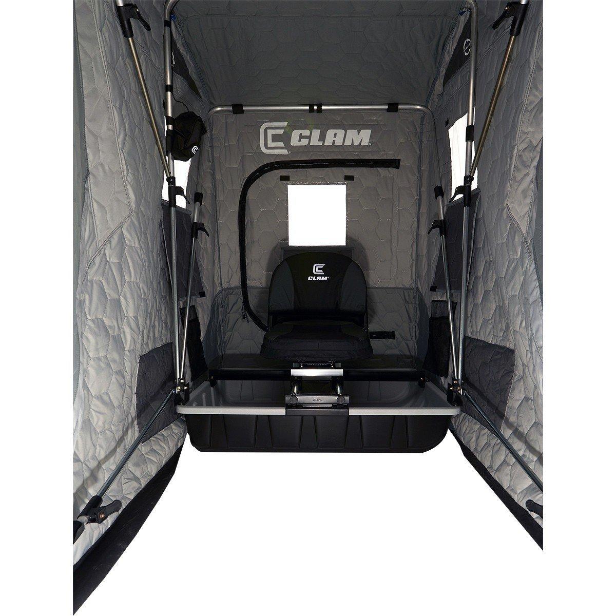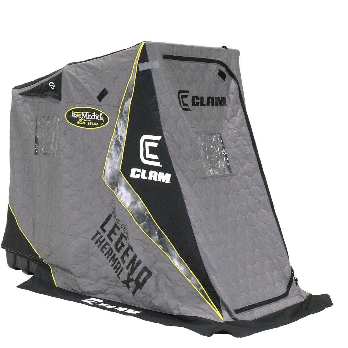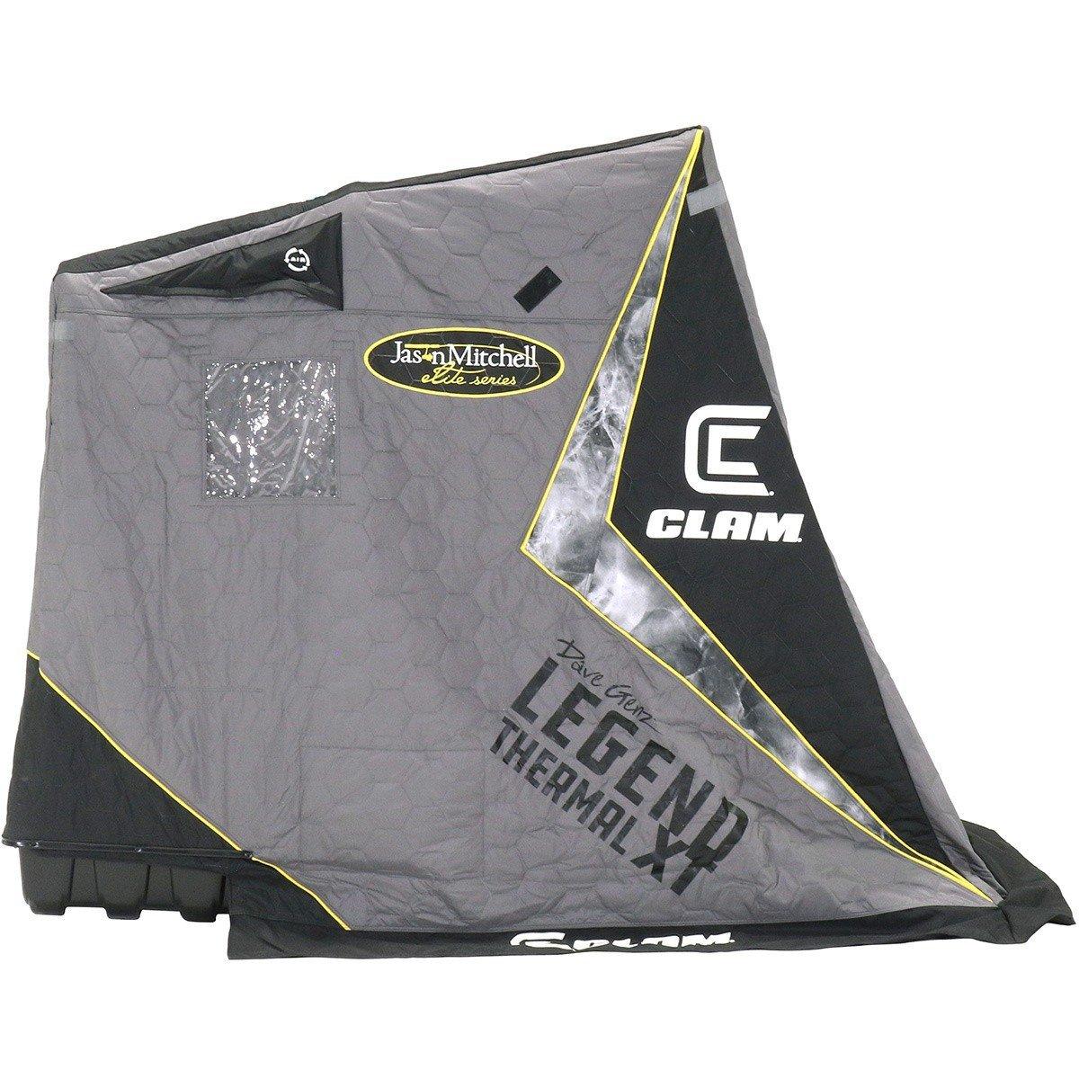 Get ready for the ice fishing season with the Clam Jason Mitchell Legend XT ice shelter. This one-man Jason Mitchell Legend XT ice shelter features a super tough 900 total denier fabric paired with a thermal skin with 90 grams of insulation per square meter. The deluxe swivel seat slides back and fourth and rotates to grab gear around your ice shelter. An XT design gives you more headroom if you need to stand in your Clam ice shelter. Plus, the gray plastic inside your tub helps you see and locate your gear easier than darker-colored tubs. For a mobile ice shelter that stores compact into a moveable sled, look to the Clam Jason Mitchell Legend XT ice shelter.