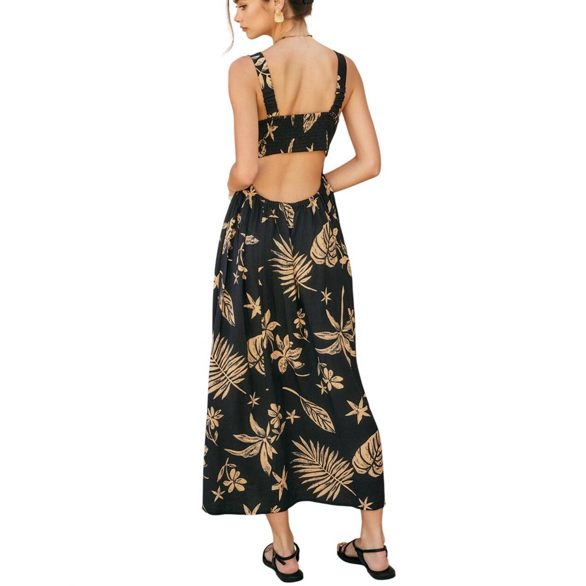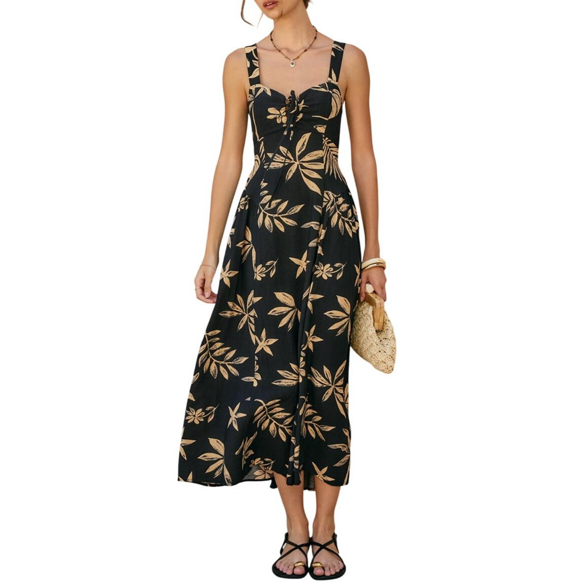 Tropical leaf printed rayon nylon blend sleeveless midi dress with front tie detail. Model is 5'9" and wearing size Small.