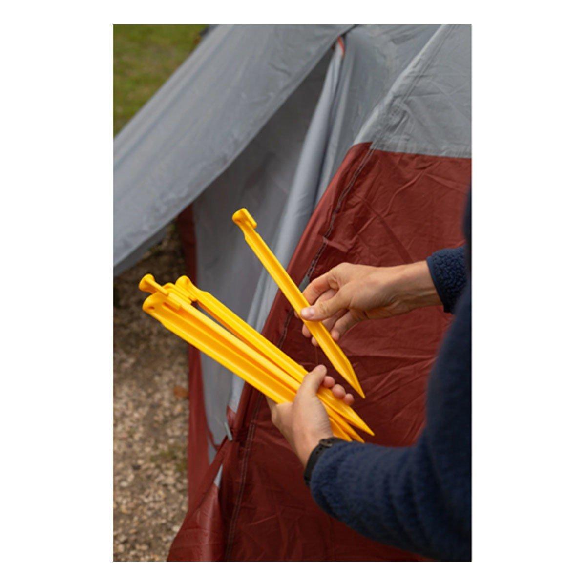 Coghlan'sTent Pegs offer durability and strength you can rely on to keep your tent where it belongs. Made of 100% post-consumer recycled plastic, these tent pegs are lightweight and light on the environment. Their wide-flanged design firmly anchors in various ground types including loose soil. The durable head can withstand mallet strikes and offers multiple options for securing your guylines.