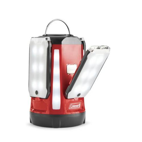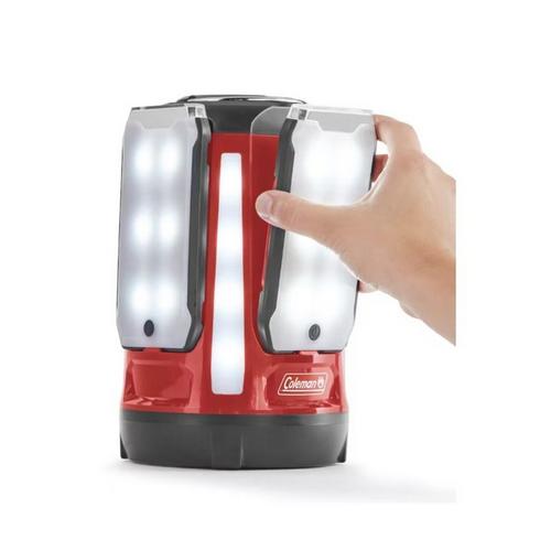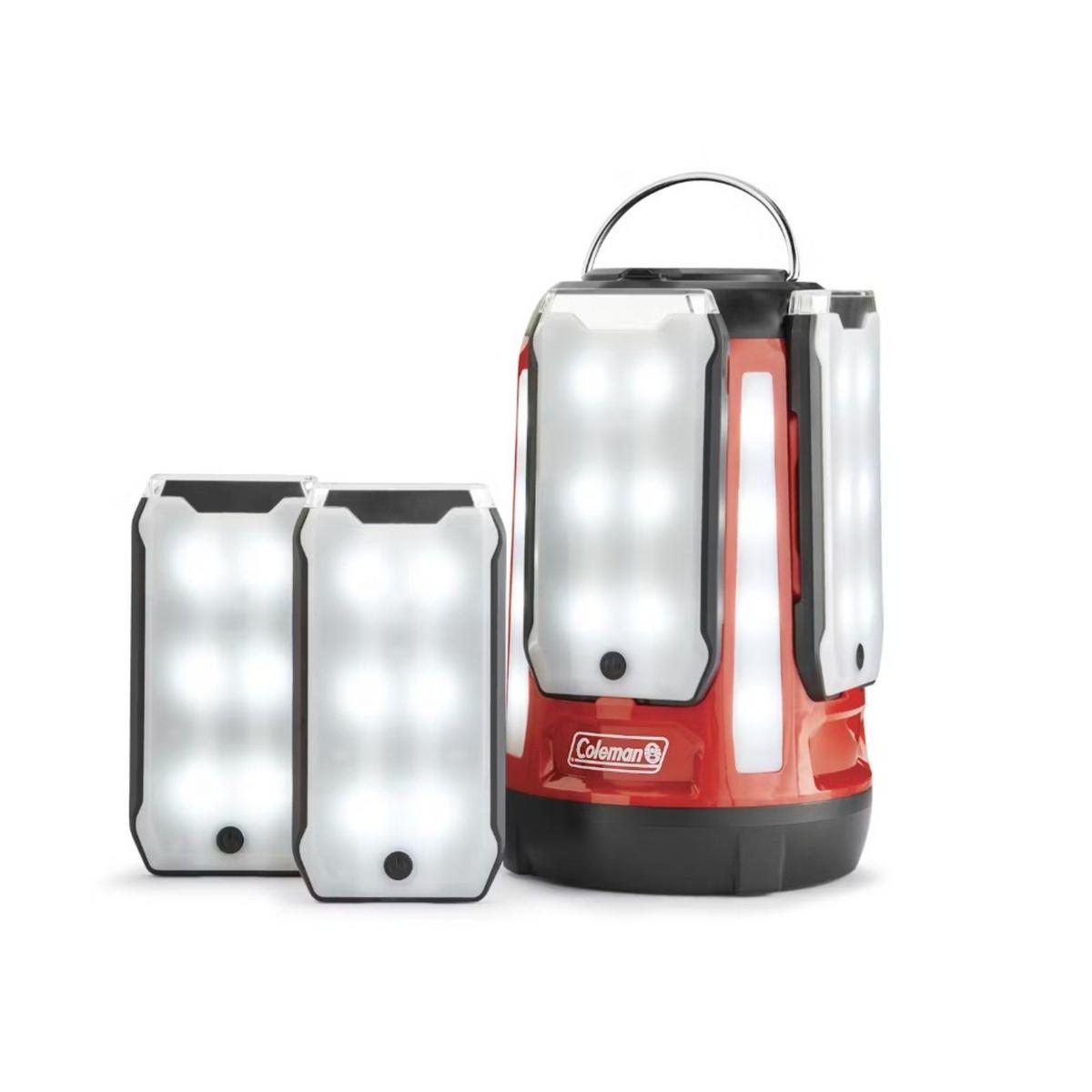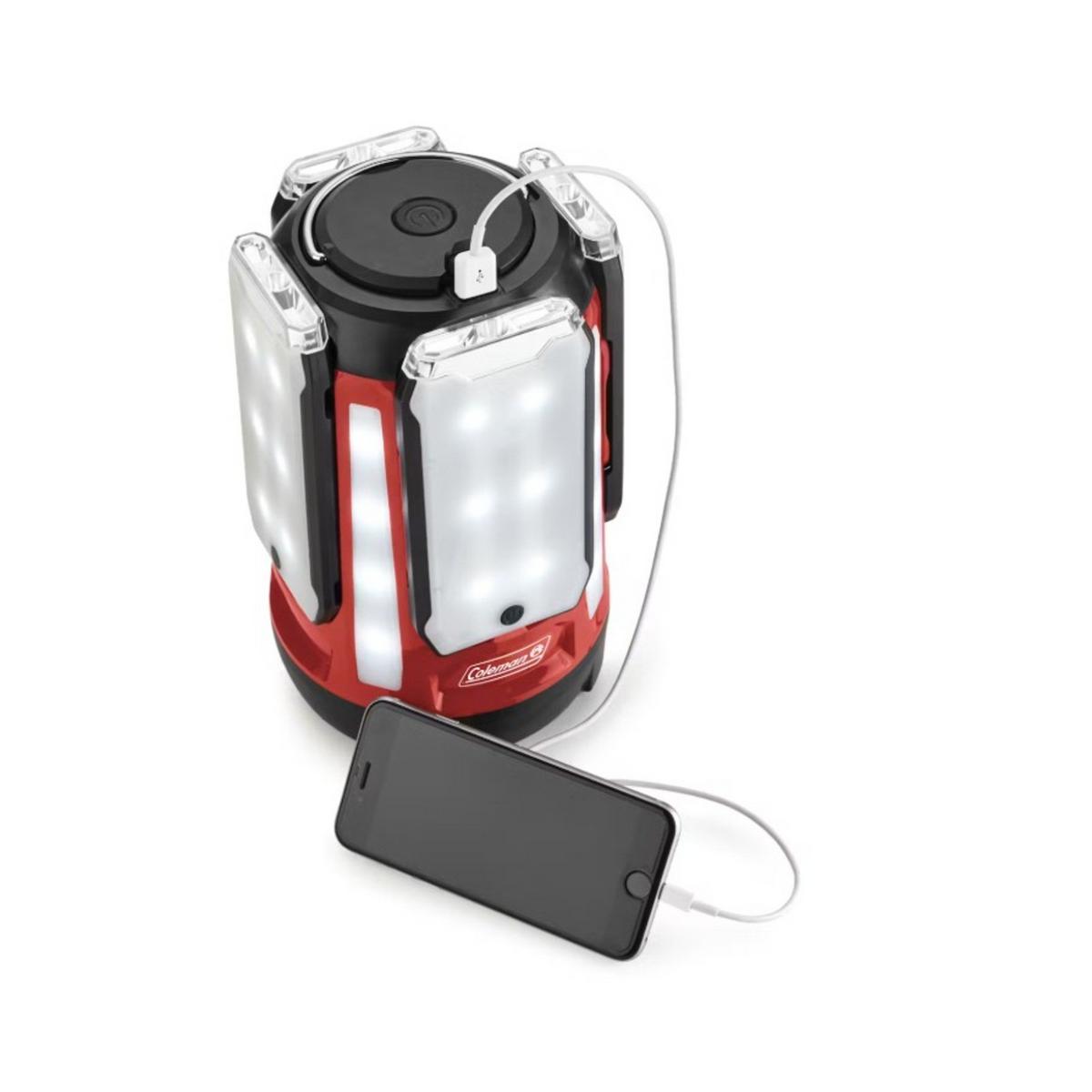 Get the convenience of multiple lights in one when you have the Coleman® Quad Pro 800L LED Lantern. When you need to take some light with you without taking the whole lantern simply pop one of the take-along light panels off the base to use as a personal light. Each panel also has a built-in flashlight providing the options of directional or area lighting whenever you leave the main area. The magnetic attachment system on each panel lets you stick them to toolboxes car hoods the steel frame of your shelter or other metal surfaces for hands-free light. Or you can flip out the fold down panel handle and use it as a stand to prop the panel up on a table. When you return the panels back to the base the batteries will automatically recharge. If every panel needs to be removed a light on the base will stay lit to help you find your way back to the main campsite. Plus with the mobile charging output you can keep your phone and other mobile devices charged if you're not around a power source or if the power is out. When everything is together the lantern shines up to 800 lumens on high for up to 20 hours or 100 lumens on low for up to 400 hours so you can enjoy good times with your friends and family long into the night.