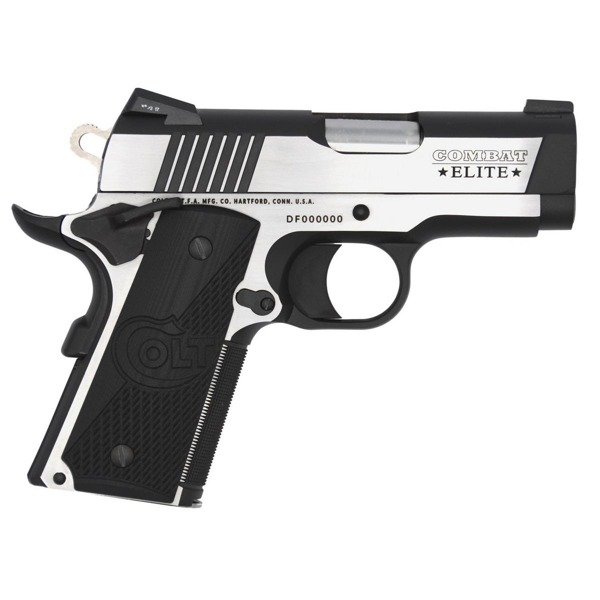 The Colt Combat Elite Defender allows for maximum concealment with the compact 3" barrel and carry Bevel slide. The Defender has full stainless steel construction with a unique two tone PVD finish which makes for a striking corrosion package. The Dual Spring Recoil System reduces felt recoil while extending the recoil spring life. Features a genuine Novak night front sight and Novak Low Mount Carry night sight. Safeties are Ambi-Extended Thumb Safety, Upswept Beavertail Grip Safety and Series 80 Firing Pin Safety. Solid Aluminum trigger with a trigger weight of 4.5-6 lbs. Specs- OAL 6.75", OAH 5.125" and OAW 1.25"; barrel technical specs- 1:16 LH, 6 Groove N.M. and locked breech operating system. Accessories include- magazine, cable lock and instruction manual.