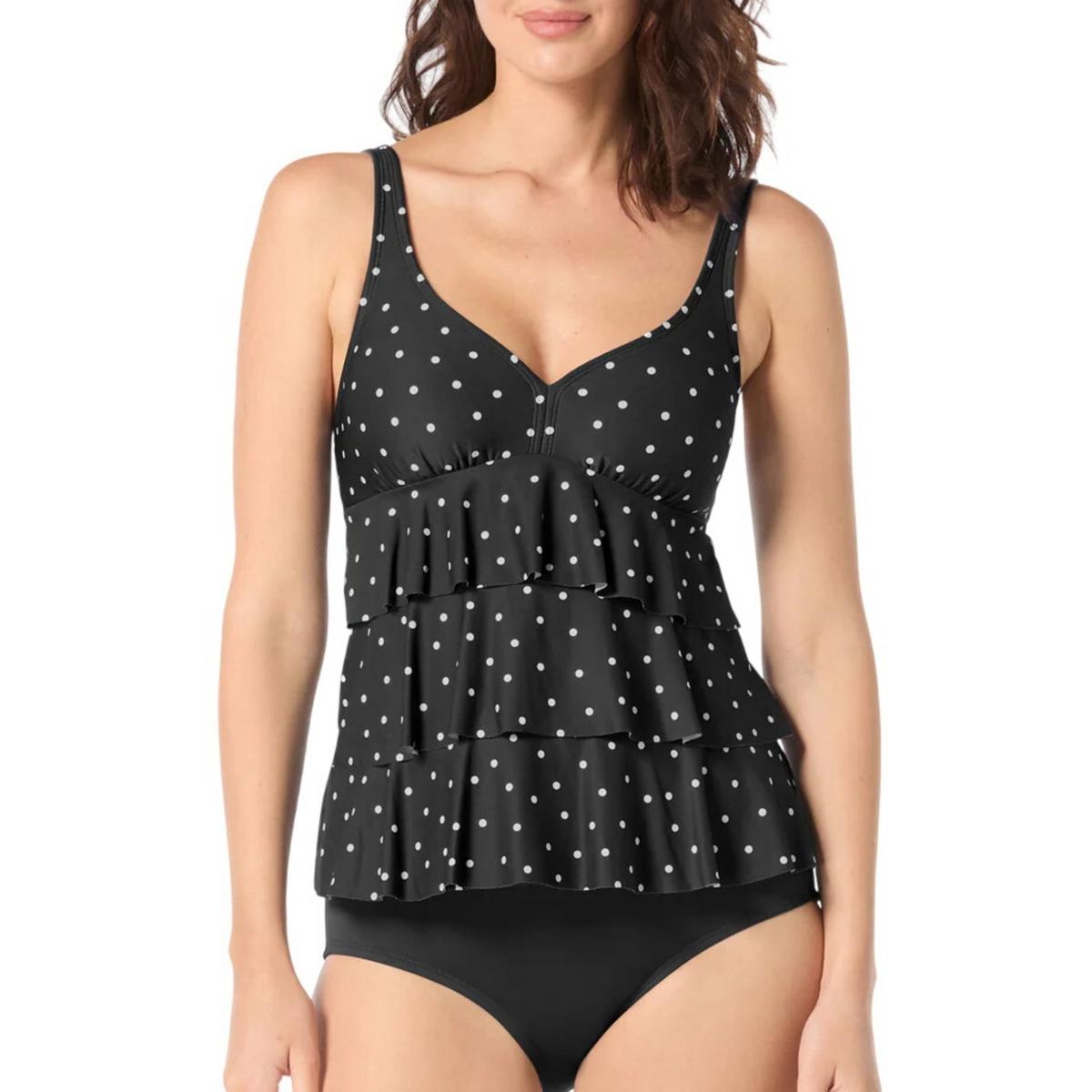 A flattering tankini top with layers of ruffles on the front that hide lines and cover your midsection. A polka dot print is feminine and flattering. Pair it with a coordinating print or solid bottom for mixing and matching.