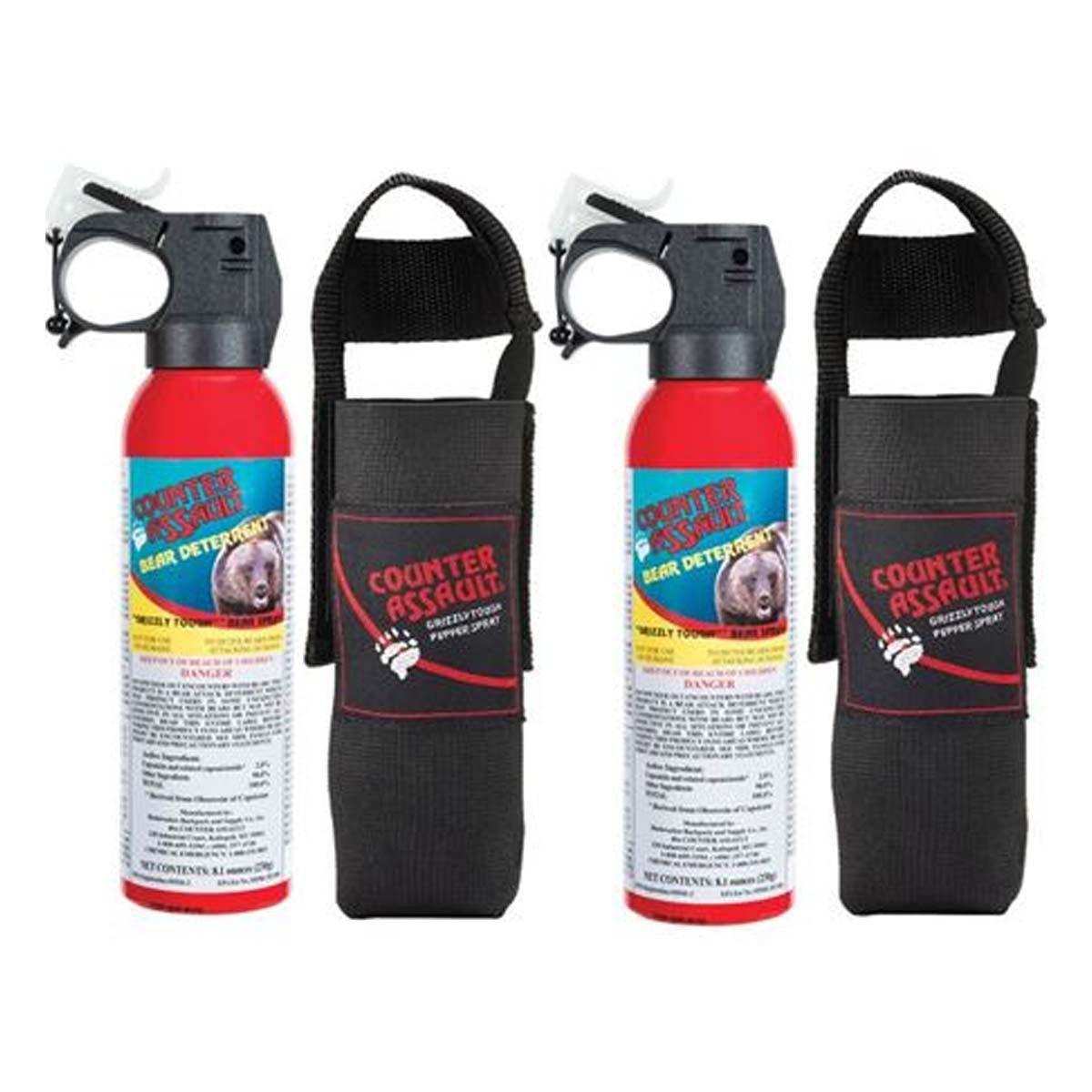 Counter Assault 7026 - Bear Spray Canister 8.1oz. Pack of two. 32 foot spray distance with 7 second continuous spray. Orange color. The hottest bear spray available by law. Developed in conjunction with University of Montana. Glow in the dark safety wedge with tie string. Comes with holster. Clam packed. ORM-D item. Proudly made in the USA. Counter Assault 7026 - Bear Spray Canister 8.1oz