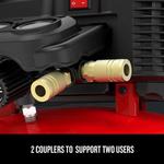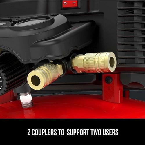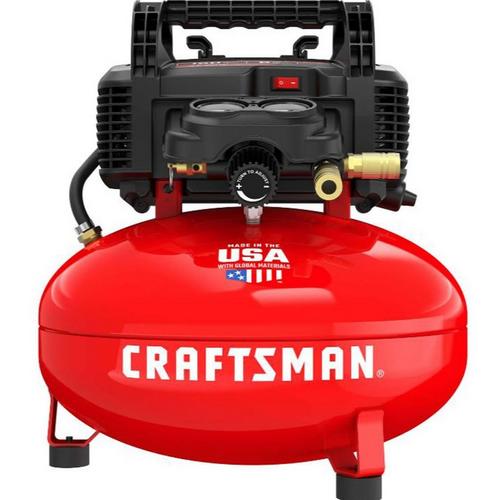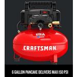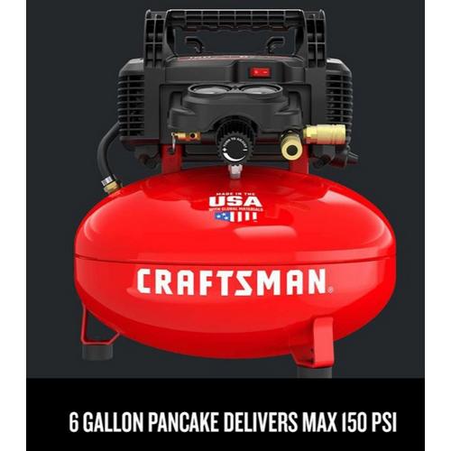 The Craftsman 150 PSI, 6 Gal. Oil-Free Pancake Compressor is ideal to support multiple trim finishing nailers, small framing/roofing jobs and all general inflation, blowing and smaller SCFM air tools. It features two regulated, factory-installed air couplers to easily support two users. The compressor body is made with steel for strength and has an upgraded shroud and console cover to protect its vital components. It is designed to operate at or below 150 PSI and features an oil-free pump, eliminating the need for maintenance. This compressor has a low-amp, 120-Volt motor that starts easily in cold weather or with an extension cord. It is designed for portability at only 30 lbs. and features an integrated carry handle.