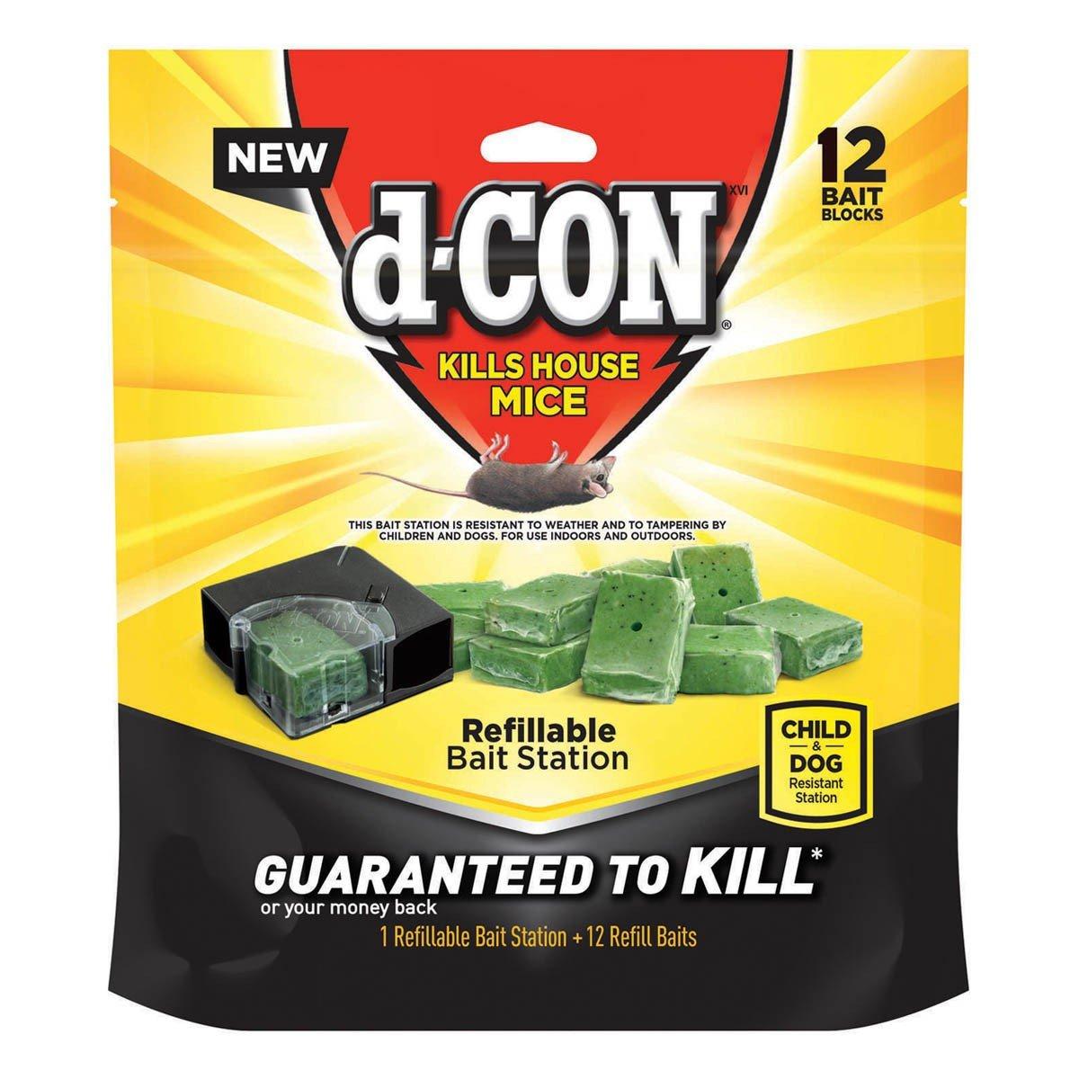 NEW from d-CON! Our new formula is made with 99% food grade ingredients. It is so d-LICIOUS that mice will risk their lives for it. The formula does not contain neurotoxins or anti-coagulants. If you have signs of mice (droppings, footprints, gnawing or scampering noises in your walls), you'll want to try this d-CON Refillable Bait Station. Place the station where you notice signs of mice activity. You'll be able to see the bait through the station to gauge if mice are eating it or not. Once you notice signs of mice feeding on the baits, mouse activity should cease within a few days. If you don't see chew marks on the bait after a few days, try moving it to another area. d-CON Disposable Corner Fit Mouse Poison Bait Stations are discreet, compact & this low profile pre-baited station comes ready-to-use. There is no need to touch the bait when placing the station. This bait station is resistant to tampering by children. Mice get the bait, Kids can't. Weather-resistant station can be used indoors or outdoors. Ideal for: corners, attics, behind appliances, basements, garages and sheds.