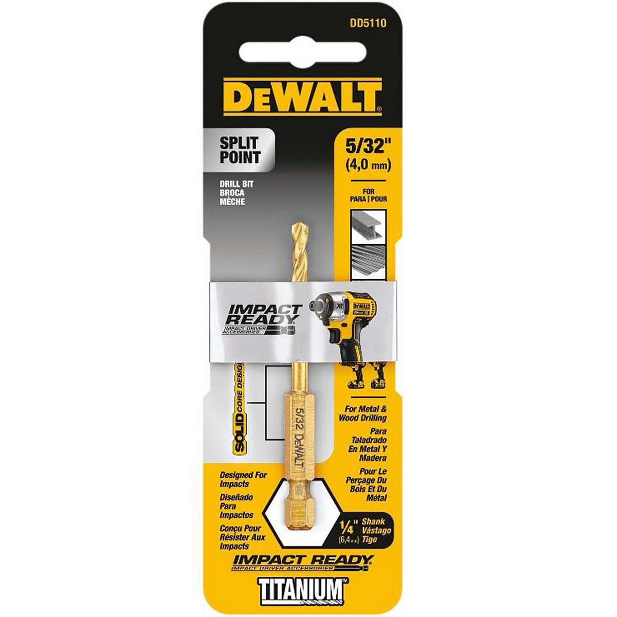 Constructed from one solid piece of heavy-duty metal, Dewalt Impact Ready titanium drill bits are up to 5 times more durable than 2-piece conventional bits. A patented web taper helps to increase bit strength and a patented Pilot Point tip delivers speed and clear, burr-free holes with helps to reduced bit walking.