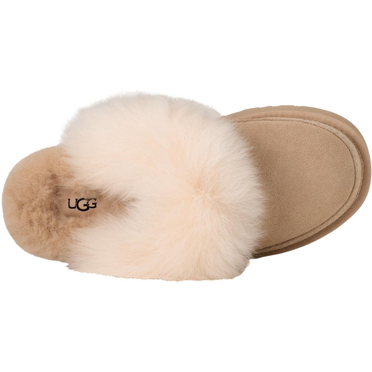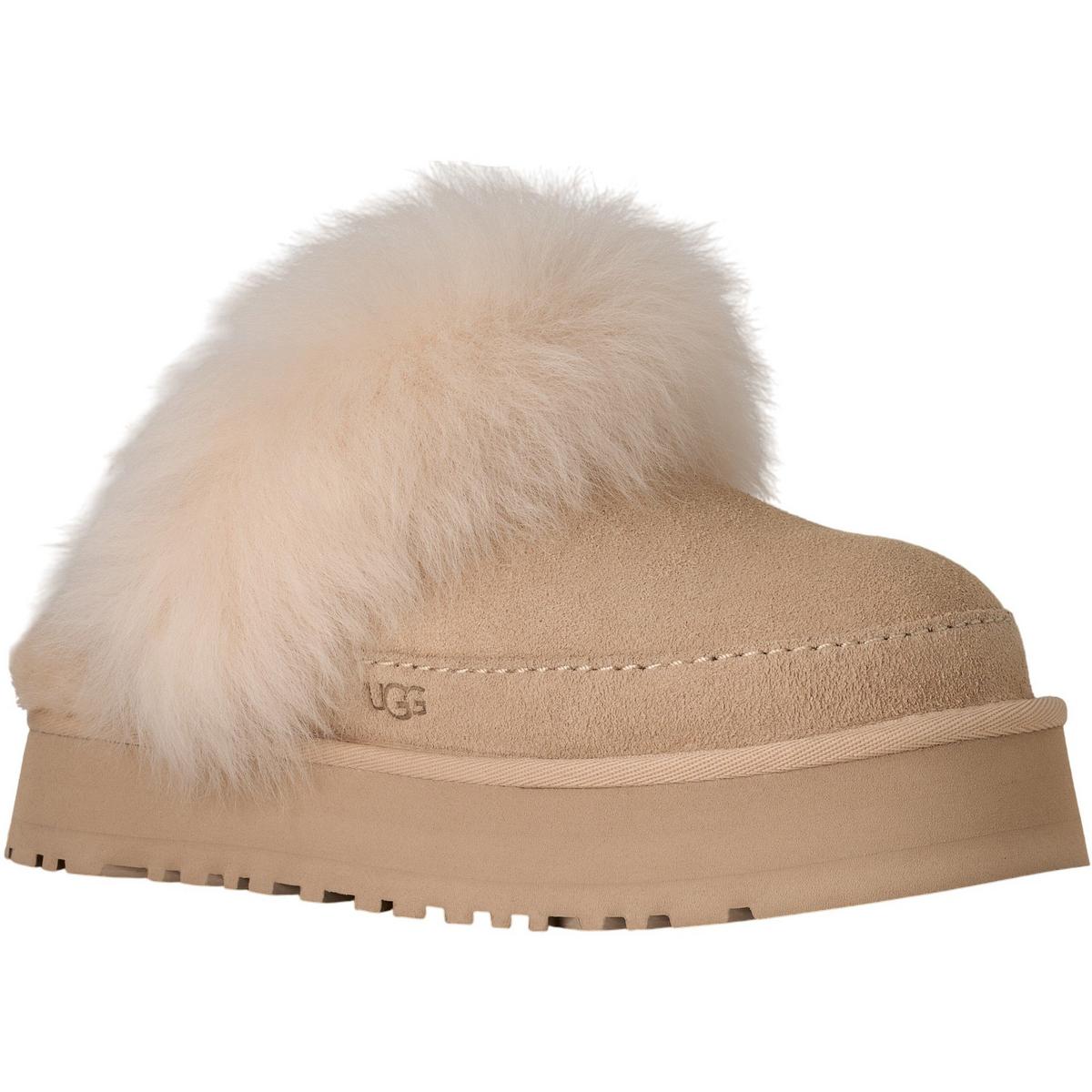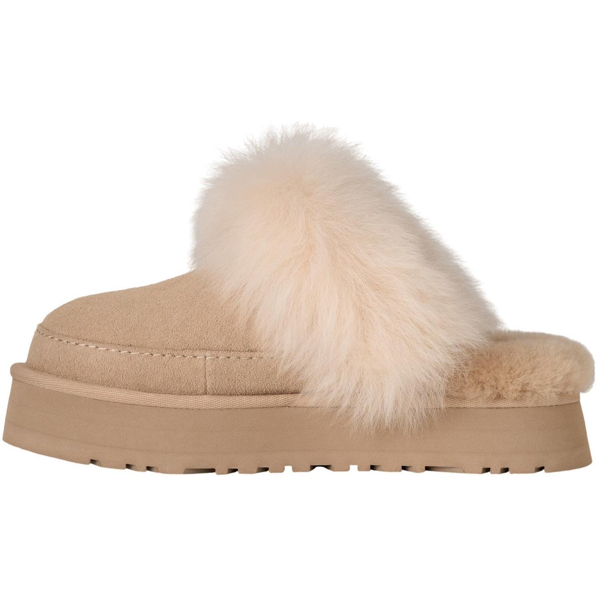 The Women's UGG Disquette Slippers are the perfect combination of style and comfort. These UGG slippers feature a retro-style platform, and EVA outsole to offer elevated style and reliable grip and traction no matter the surface. Made from soft suede, the upper is durable and stylish, while the sheepskin collar enhances style and warmth. Whether you're lounging around the house or running around town, the Women's UGG Disquette Slippers will keep your feet feeling cozy all day long.