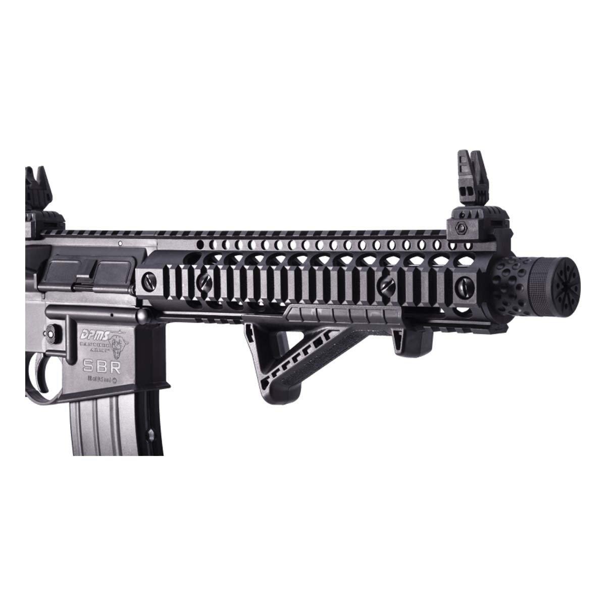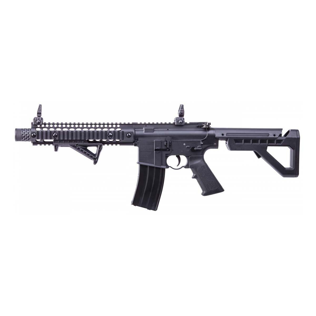 Get your hands on an air gun that can do it all. The Crosman DPMS SBR is a full/semi-auto air rifle that fires BBs at a blistering 430 FPS at a rate of 1400 rounds per minute! Powered by two 12-gram CO₂ cartridges, the SBR’s excellence is further defined by features like its dual-action selector, a genuine real-feel body, and a six-point adjustable rear stock.
