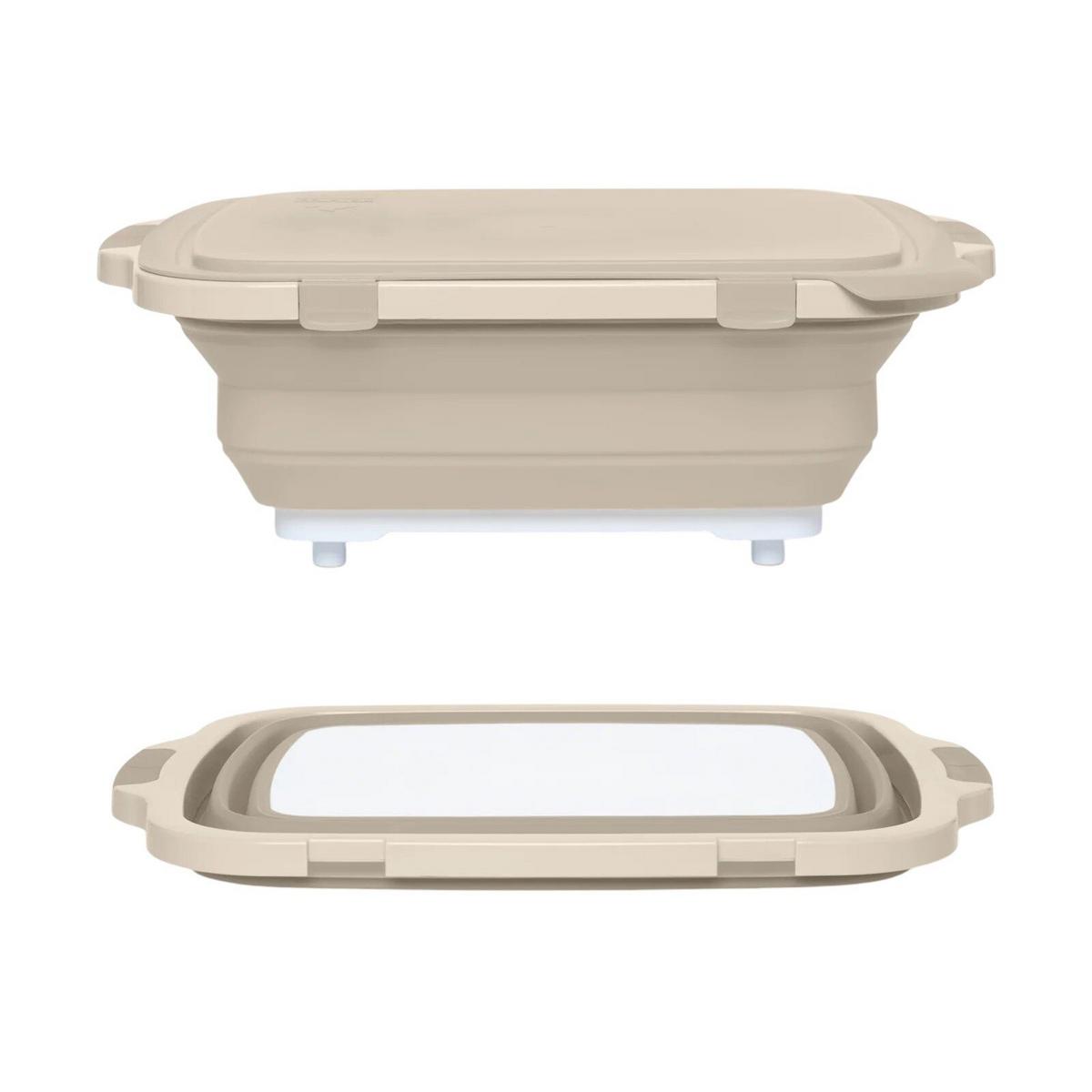 The new "V2" Prep Tub has a built in nylon cutting board and lid with locking hinges. It adjusts to 3 different heights and collapses for easy kitchen storage.Available in three sizes (XL, Original, Junior) and offered in two colors Classic Orange and Pit Master Black. Our bestselling BBQ Prep Tub makes prep, marinating, and cleanup easy. Available in 3 sizes! Collapsible design includes a built-in cutting board. It's a game changer.